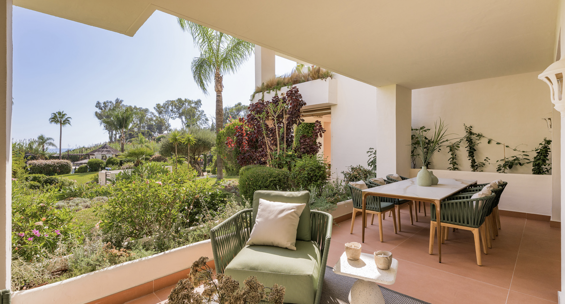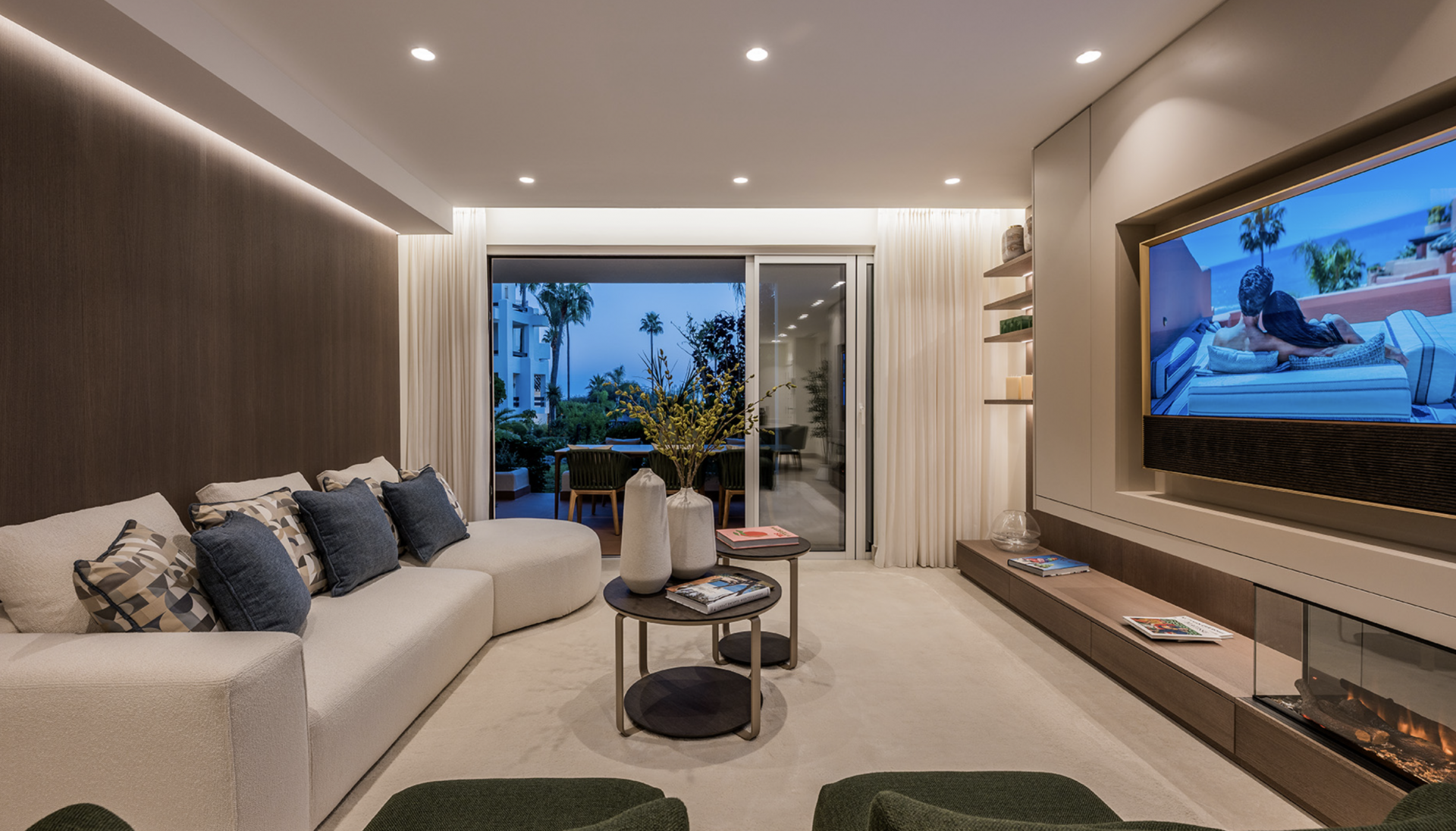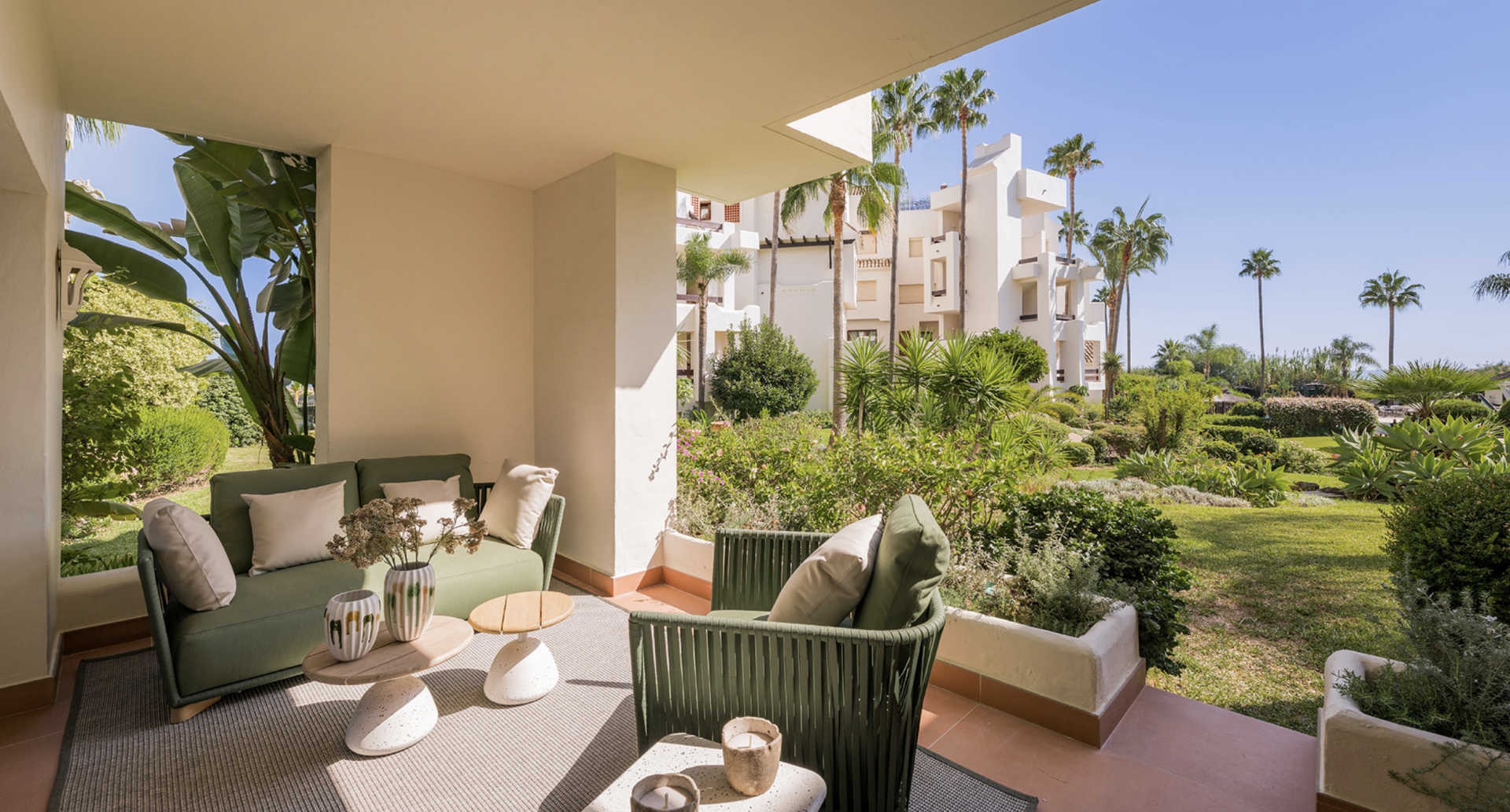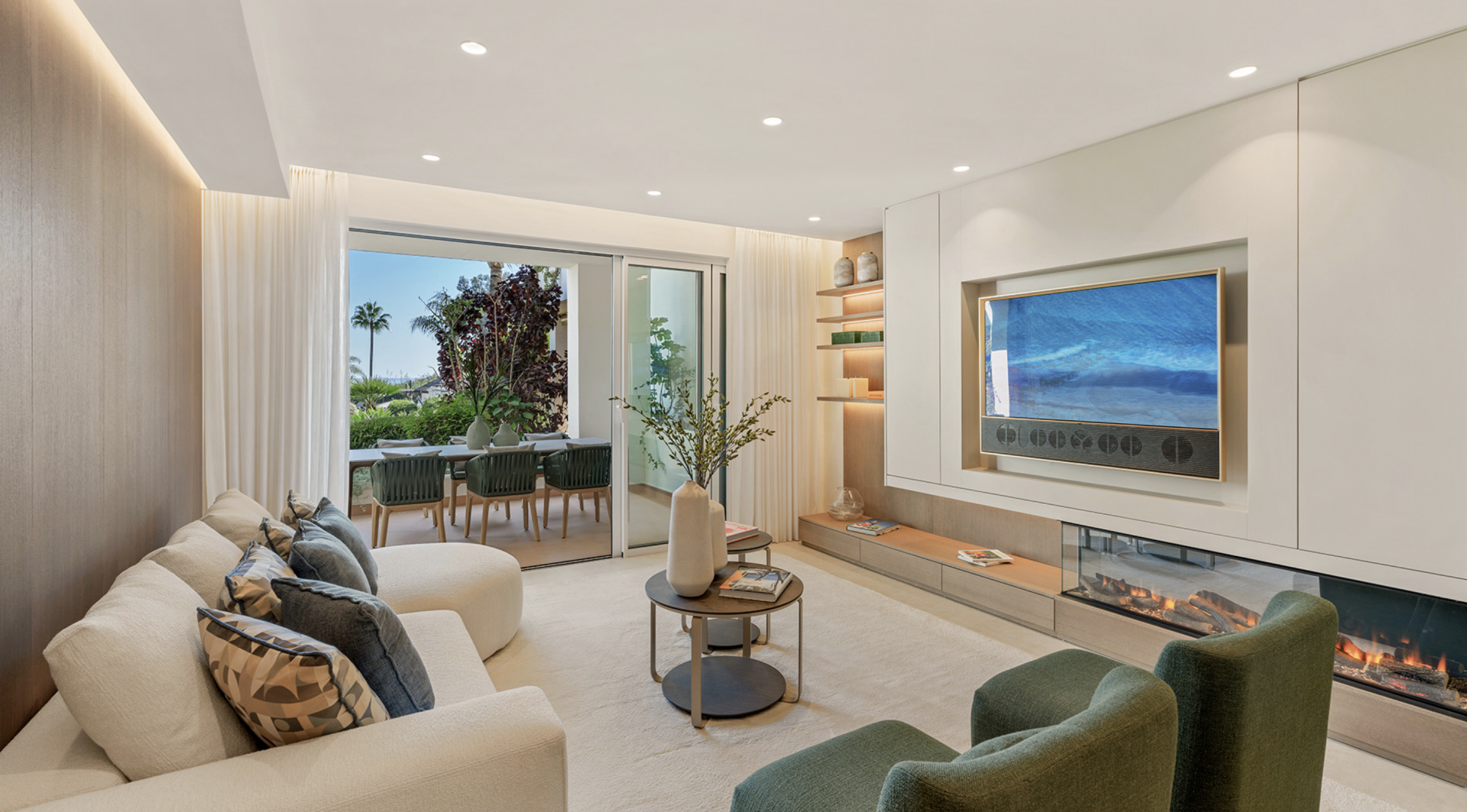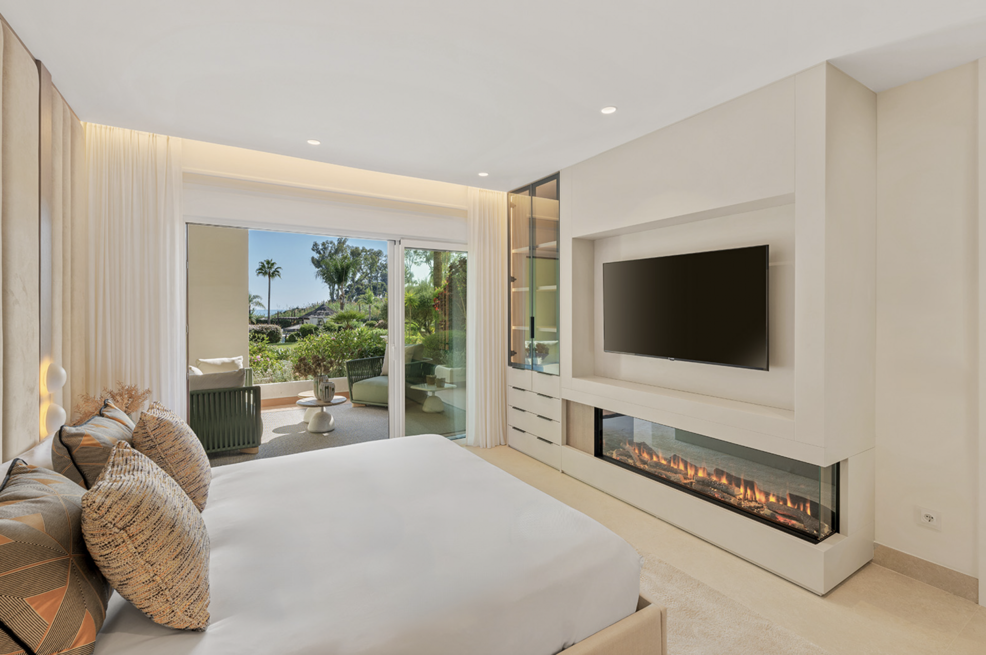 Exclusive community situated between Marbella and Estepona. It features a stunning pool area with a snack bar, lush tropical gardens, and round-the-clock security. This prime location offers access to one of the best beaches in the region.This stunning apartment features an open-plan living space with contemporary furnishings and high-end finishes, including custom wardrobes, elegant flooring, an electric fireplace, and a Bang & Olufsen sound system. The designer kitchen is fully equipped, and the open living area leads to a private terrace with sea views. Fully furnished and ready to move in. Includes an underground parking space and a convenient storage room in the basement. Offers the perfect blend of luxury and tranquility. The apartment has direct access to a private terrace and lush tropical gardens. The peaceful atmosphere of the community enhances the feeling of serenity, while the modern design of the apartment ensures comfort and style.