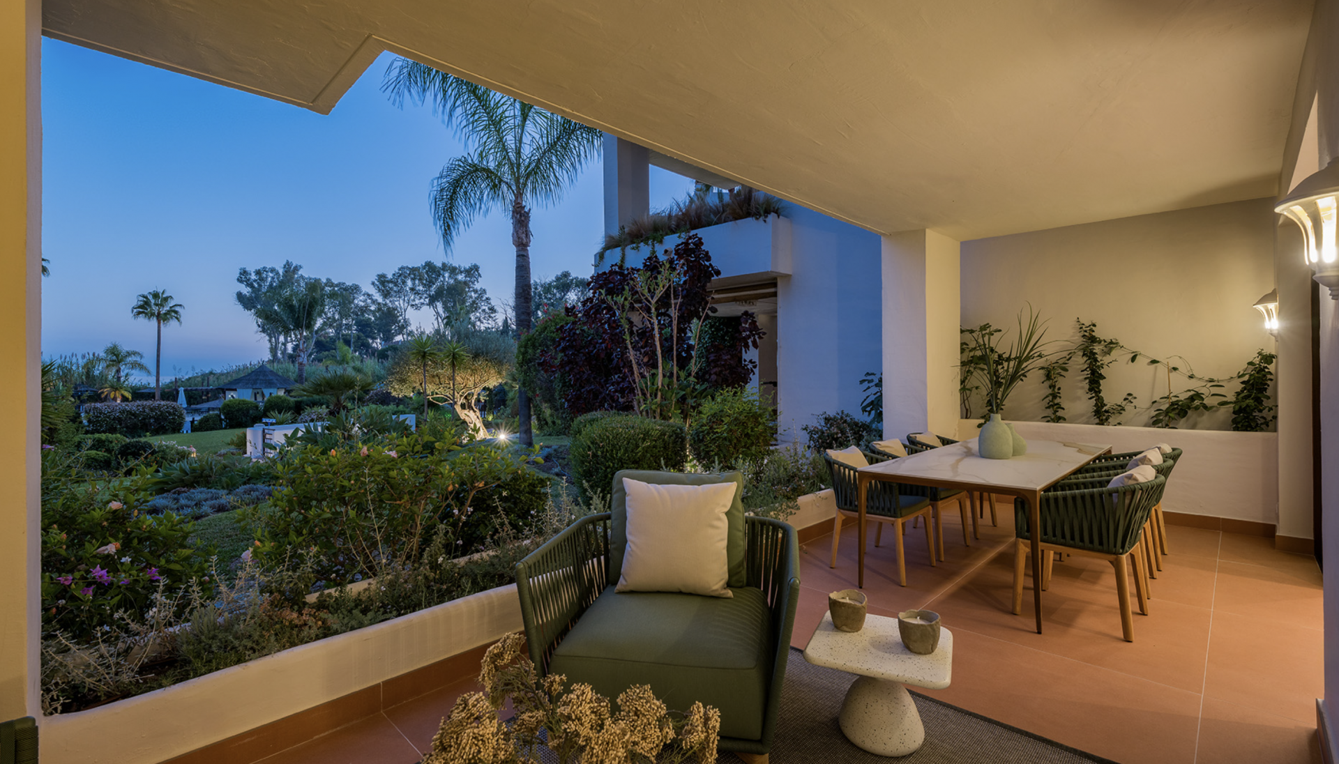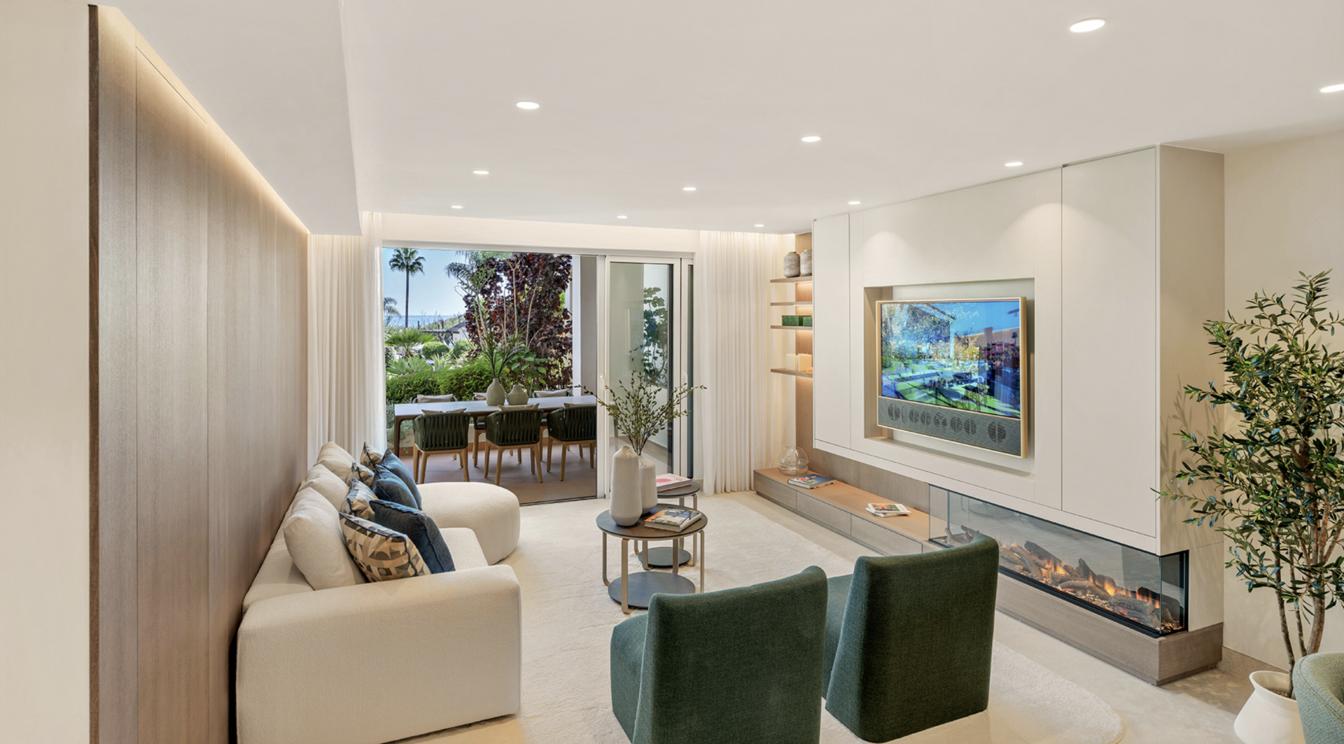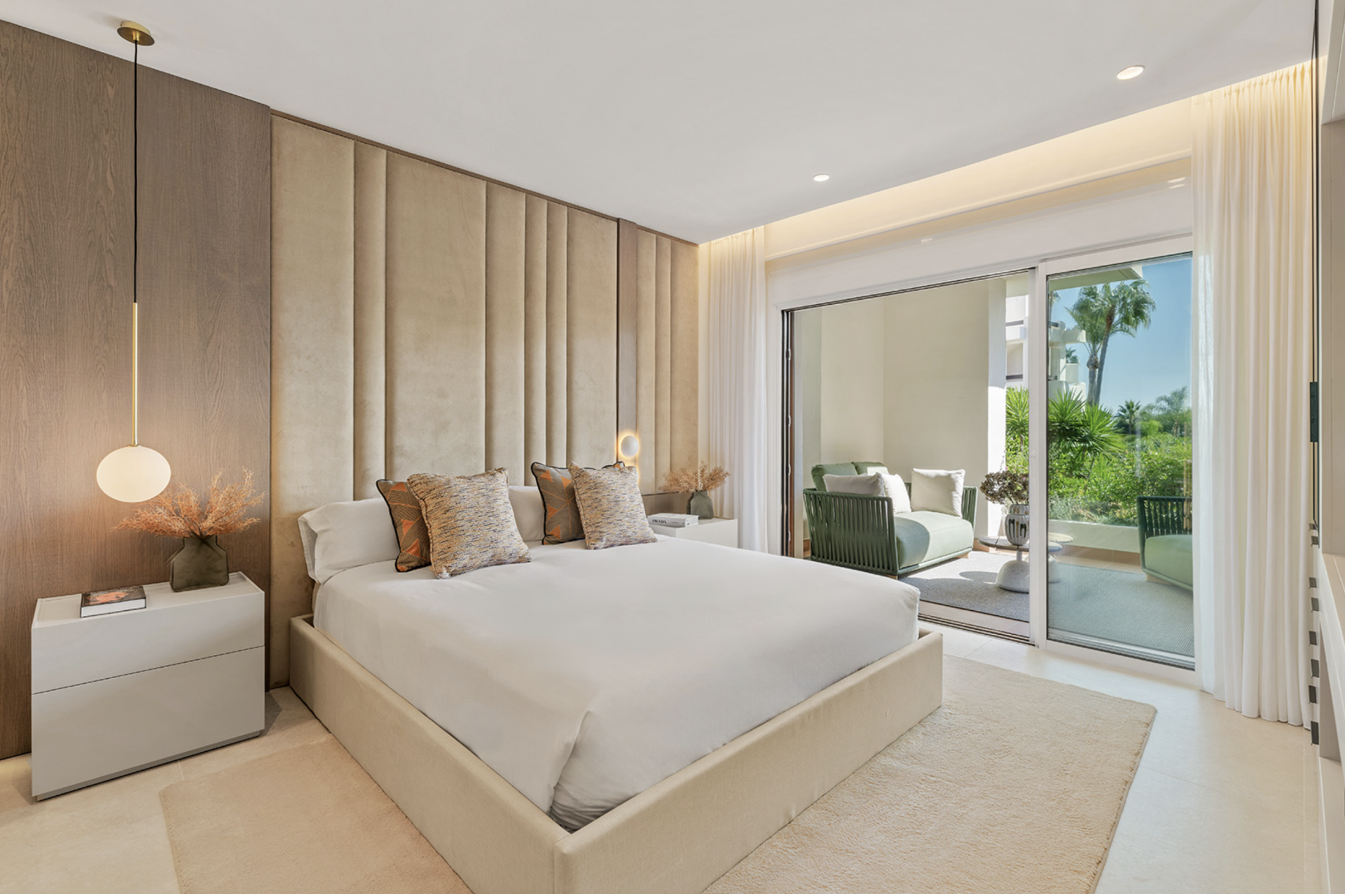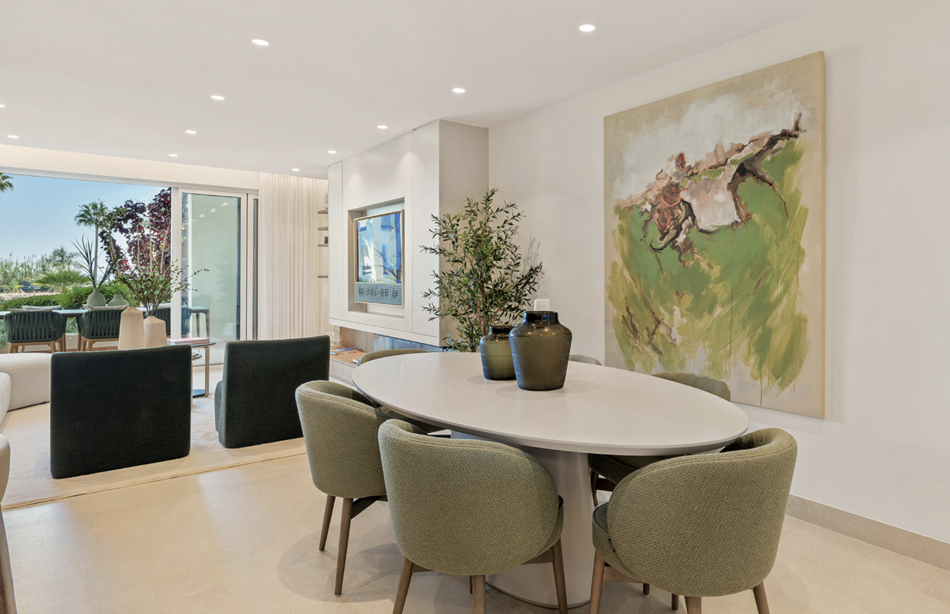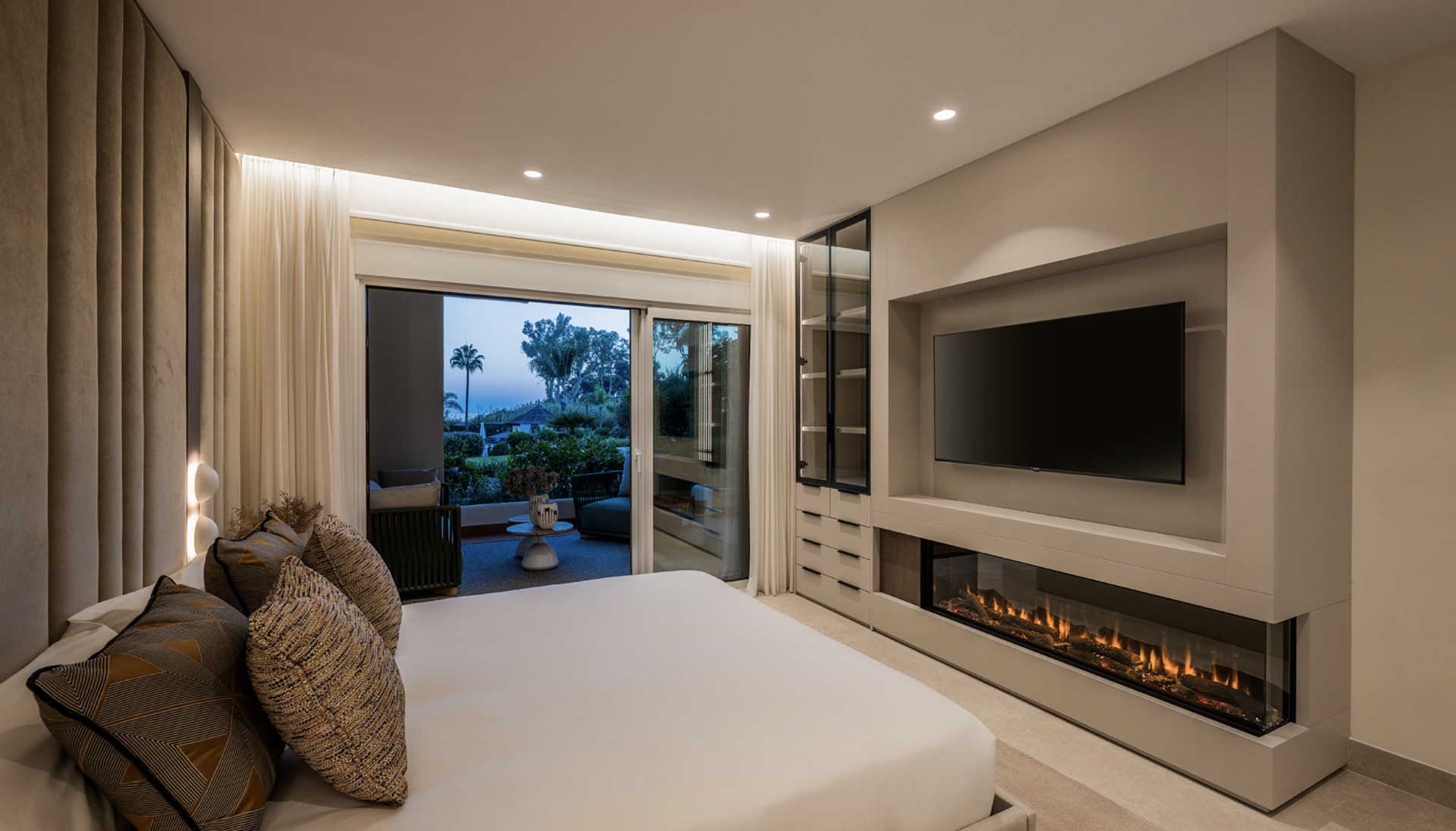 Exclusive community situated between Marbella and Estepona. It features a stunning pool area with a snack bar, lush tropical gardens, and round-the-clock security. This prime location offers access to one of the best beaches in the region.This stunning apartment features an open-plan living space with contemporary furnishings and high-end finishes, including custom wardrobes, elegant flooring, an electric fireplace, and a Bang & Olufsen sound system. The designer kitchen is fully equipped, and the open living area leads to a private terrace with sea views. Fully furnished and ready to move in. Includes an underground parking space and a convenient storage room in the basement. Offers the perfect blend of luxury and tranquility. The apartment has direct access to a private terrace and lush tropical gardens. The peaceful atmosphere of the community enhances the feeling of serenity, while the modern design of the apartment ensures comfort and style.