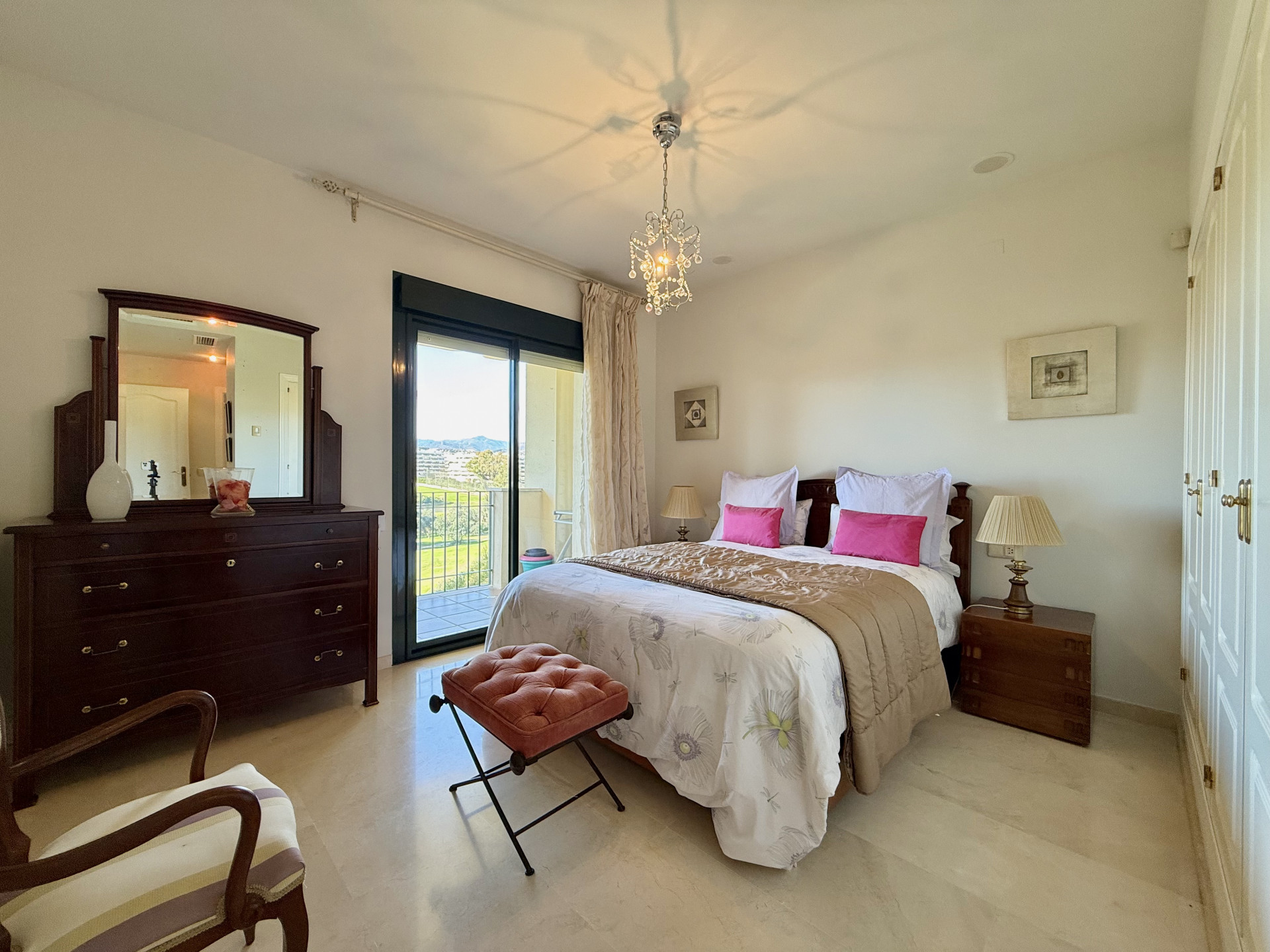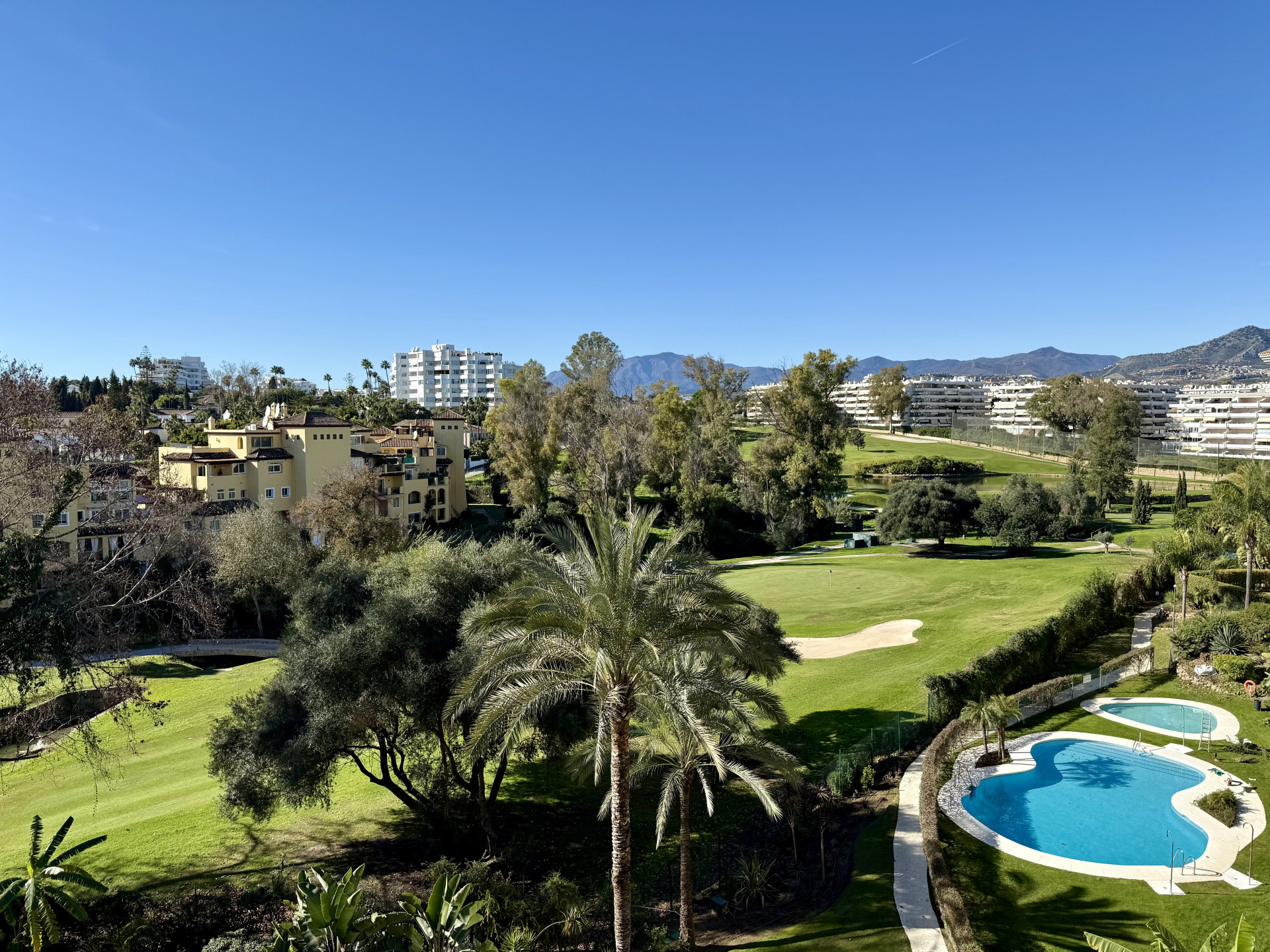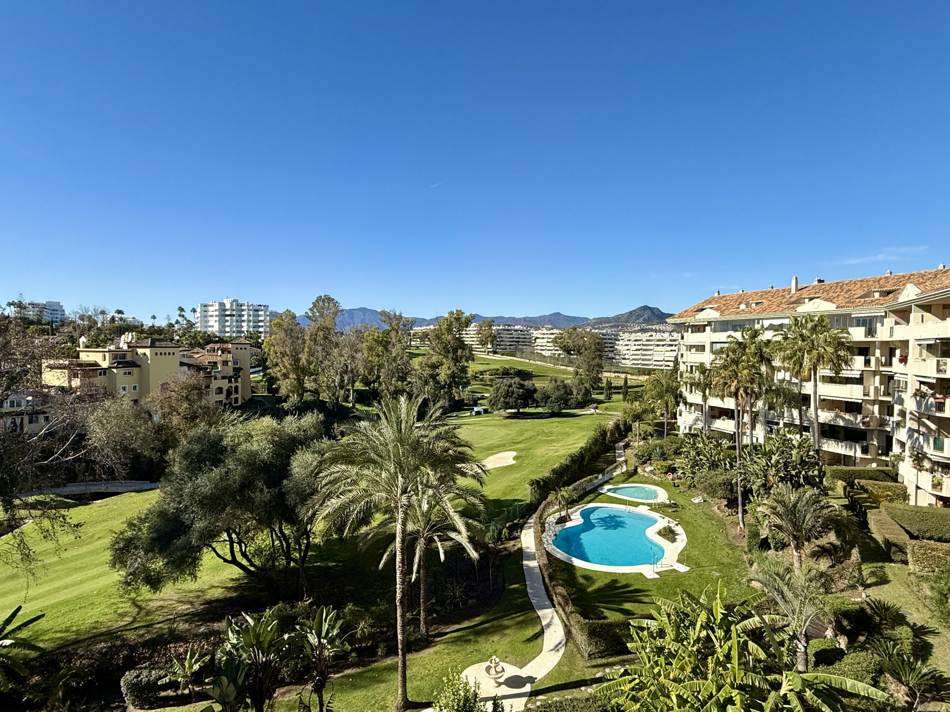 Excelente oportunidad! vistas panorámicas, orientación oeste, en primera línea de golf en Guadalmina Alta. Ubicación inmejorable a corta distancia del centro de San Pedro de Alcántara, donde encontrará fácilmente tiendas, colegios y todos los servicios necesarios. A tan solo 10 minutos en coche de Puerto Banús, lo que convierte esta propiedad en una combinación insuperable de tranquilidad, comodidad y estilo de vida. El apartamento consta de 2 dormitorios y 2 baños, el dormitorio principal con baño en suite y acceso directo a la terraza. Amplio salón-comedor con acceso directo a una gran terraza cubierta, ideal para disfrutar durante todo el año de la vida al aire libre y de las vistas abiertas. La cocina está totalmente equipada e incluye un lavadero independiente. La orientación oeste ofrece abundante luz natural y hermosos atardeceres. Extras incluidos: aire acondicionado frío/calor, armarios empotrados, plaza de garaje subterránea y trastero, todo incluido en el precio. Complejo cerrado y seguro con vigilancia 24 horas, jardines paisajísticos, varias piscinas y gimnasio totalmente equipado. Esta magnífica propiedad cuenta con Licencia de Primera Ocupación (LPO).