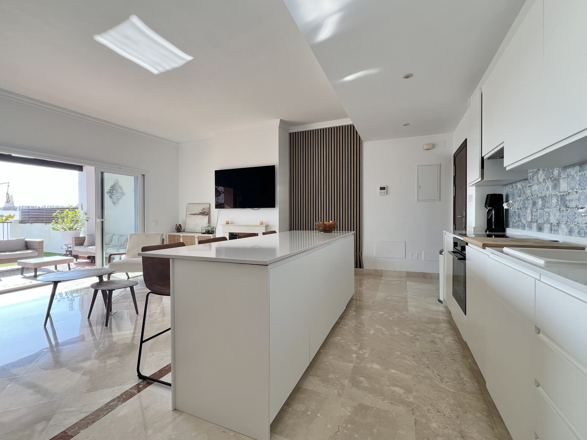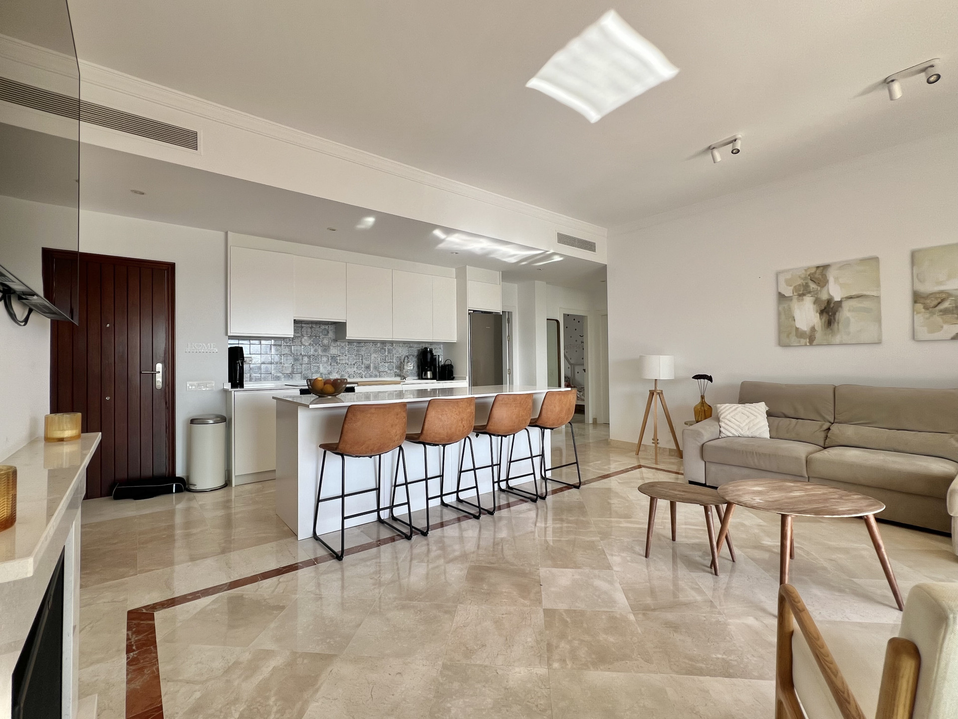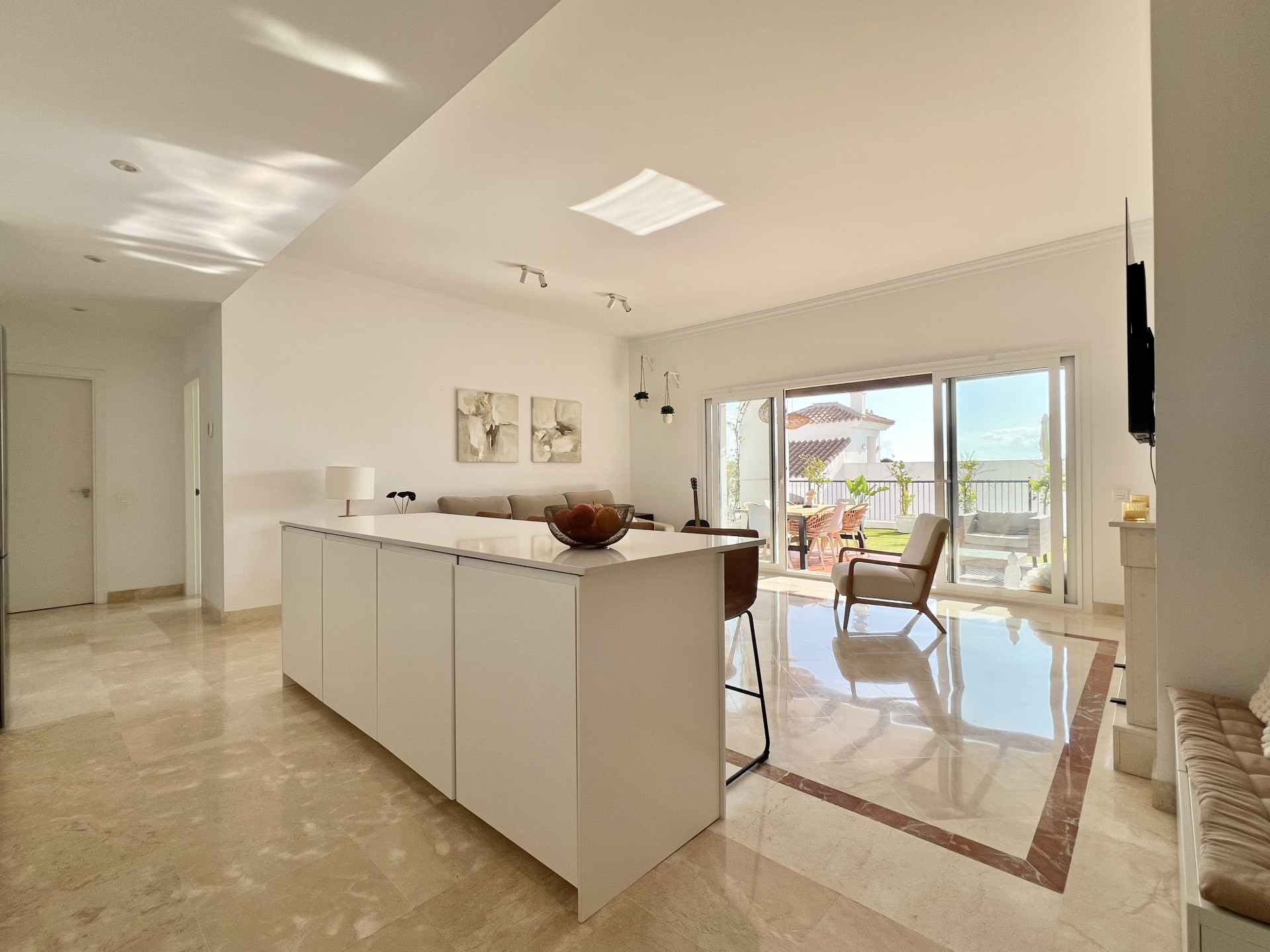 Espectacular apartamento con licencia turística de 3 dormitorios y 2 baños, ubicado en una planta baja elevada que combina privacidad, confort y un excepcional espacio exterior. Diseñado con un concepto de cocina y salón abiertos, el interior se distingue por su luminosidad, amplitud y un ambiente acogedor que, desde el primer instante, transmite la sensación de hogar. Uno de los mayores atractivos de esta propiedad es su amplia terraza privada, ideal para tomar el sol, disfrutar de comidas al aire libre o simplemente relajarse. Es el lugar perfecto tanto para familias como para parejas o aquellos que buscan un refugio espacioso dentro de un entorno estilo resort. Situado en uno de los desarrollos más exclusivos de la zona, los residentes disfrutan de acceso a una amplia gama de instalaciones de alta gama. Estas incluyen siete piscinas exteriores, una de ellas una hermosa piscina estilo laguna, junto con una piscina cubierta climatizada, un gimnasio completamente equipado, un centro de yoga y un lujoso spa. El complejo también cuenta con su propio restaurante, supermercado en el sitio y espacio de coworking, lo que lo hace ideal tanto para vivir de vacaciones como para la comodidad durante todo el año. Para los amantes del golf, hay un putting green, mientras que las familias apreciarán las piscinas infantiles y las áreas de juego. El complejo está rodeado de amplias zonas verdes y tranquilos senderos para caminar, ofreciendo una sensación de paz y tranquilidad en todo