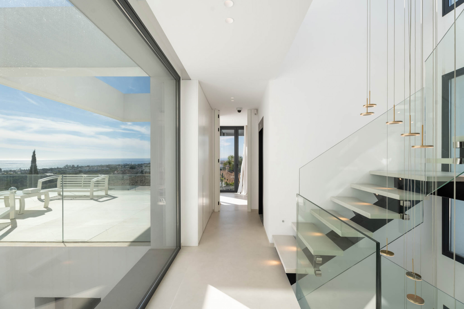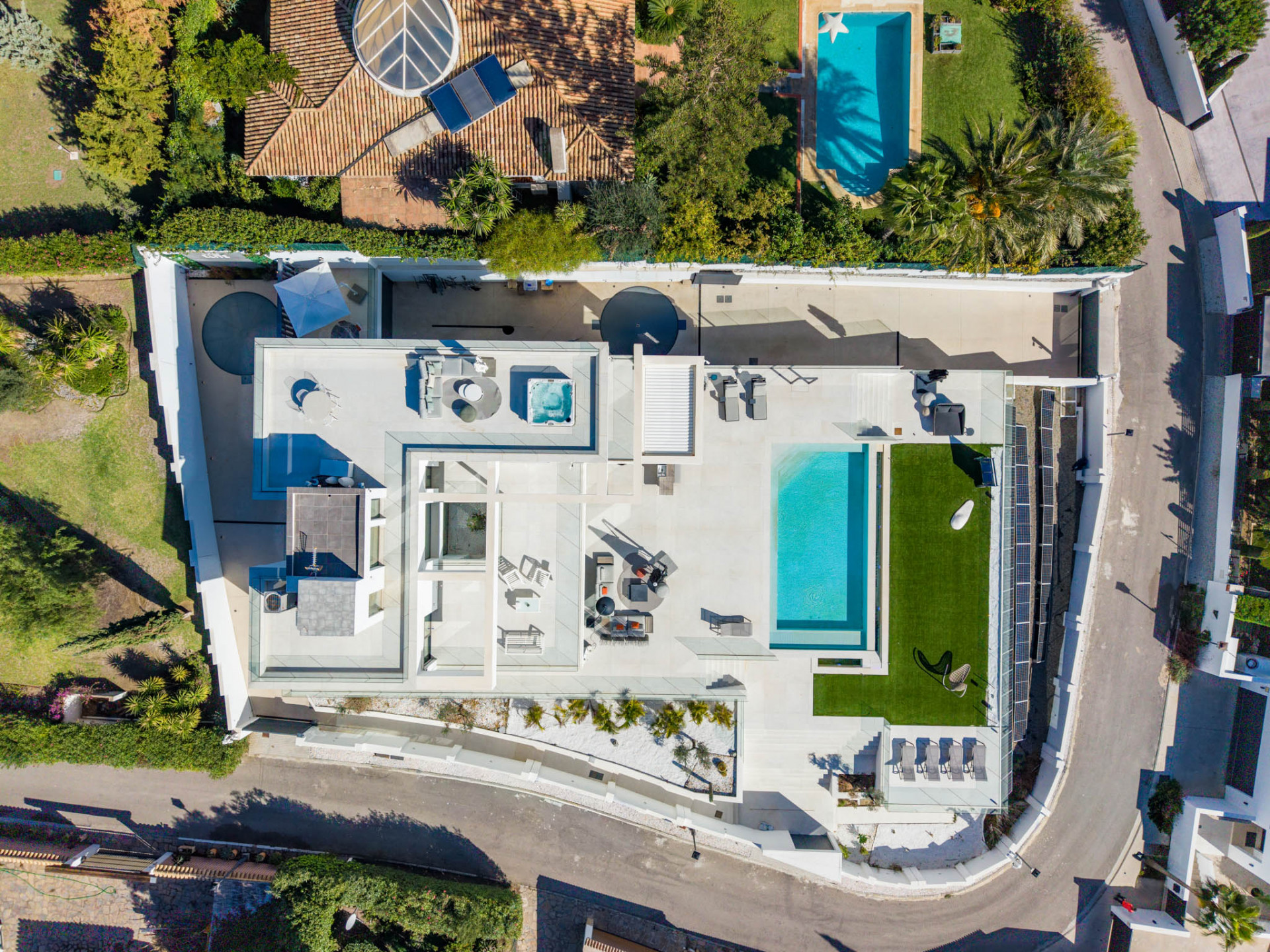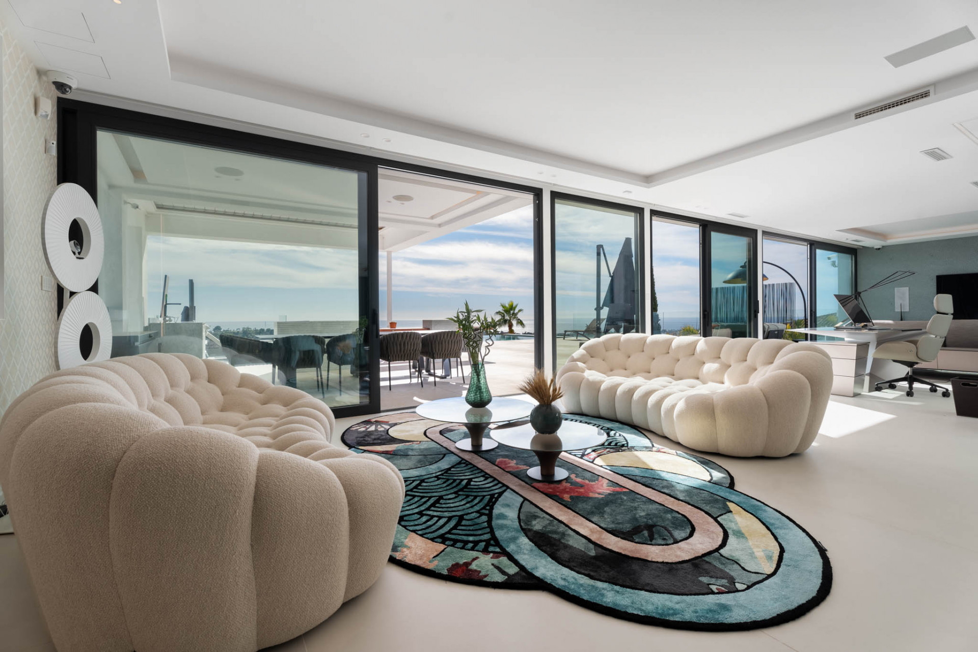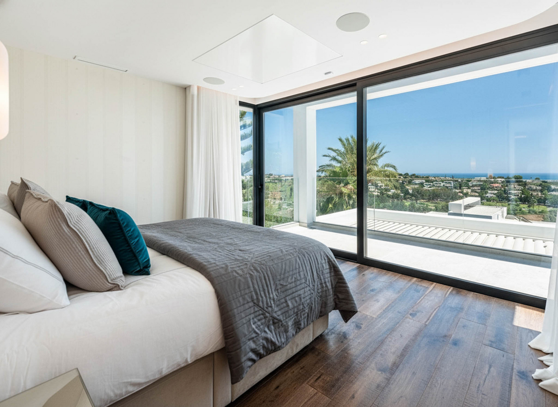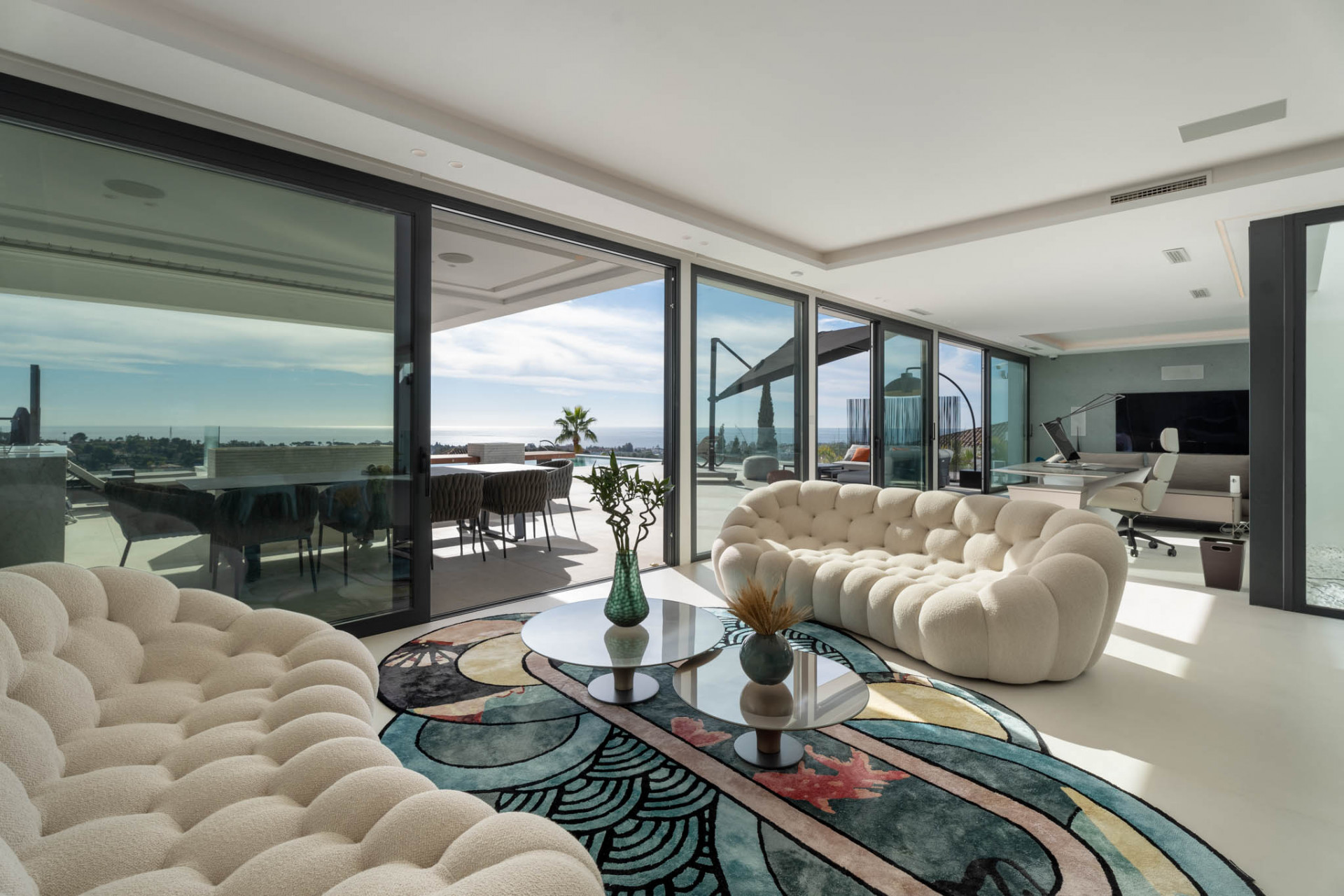 Esta villa de diseño en Paraiso Alto se presenta como una residencia de estilo contemporáneo creada para quienes buscan privacidad, amplitud y una conexión directa con el entorno. Su posición elevada permite disfrutar de vistas a El Paraíso Golf, el Mediterráneo, Gibraltar, la costa africana y la montaña de La Concha desde varias estancias y zonas exteriores, creando un entorno visual distintivo. La propiedad se distribuye en varios niveles conectados por un ascensor, con amplias estancias y luz natural que fluye por toda la vivienda. En la planta principal, salón y comedor tienen acceso directo a la terraza y al jardín a través de grandes ventanales que integran el exterior con el interior. La piscina infinita se extiende hacia el horizonte, reforzando la sensación de continuidad con el paisaje. La villa ofrece seis dormitorios, todos con baños en suite diseñados para el confort y la privacidad. La suite principal disfruta de vistas al mar y acceso a una terraza privada. La planta superior incluye un solárium con jacuzzi y vistas panorámicas que abarcan desde el campo de golf hasta África, proporcionando un espacio exclusivo para contemplar el entorno desde el punto más alto de la propiedad. La planta inferior alberga las áreas de bienestar y entretenimiento, incluyendo una sala de cine, gimnasio, sauna y un espacio independiente diseñado para reuniones. La propiedad también cuenta con un amplio garaje con plataformas giratorias que facilitan la maniobrabilidad. Un sistema centralizado de domótica permite el control remoto de diversos aspectos de la villa, mientras que la instalación solar de alta capacidad contribuye a la eficiencia energética. El diseño general prioriza las líneas limpias, proporciones equilibradas y transiciones fluidas entre los espacios. Ubicada a menos de diez minutos de la playa y con rápido acceso a Puerto Banús y Marbella, esta villa ofrece una residencia contemporánea en una zona consolidada de Benahavís, combinando amplitud, vistas abiertas y una distribución arquitectónica pensada para la vida diaria.