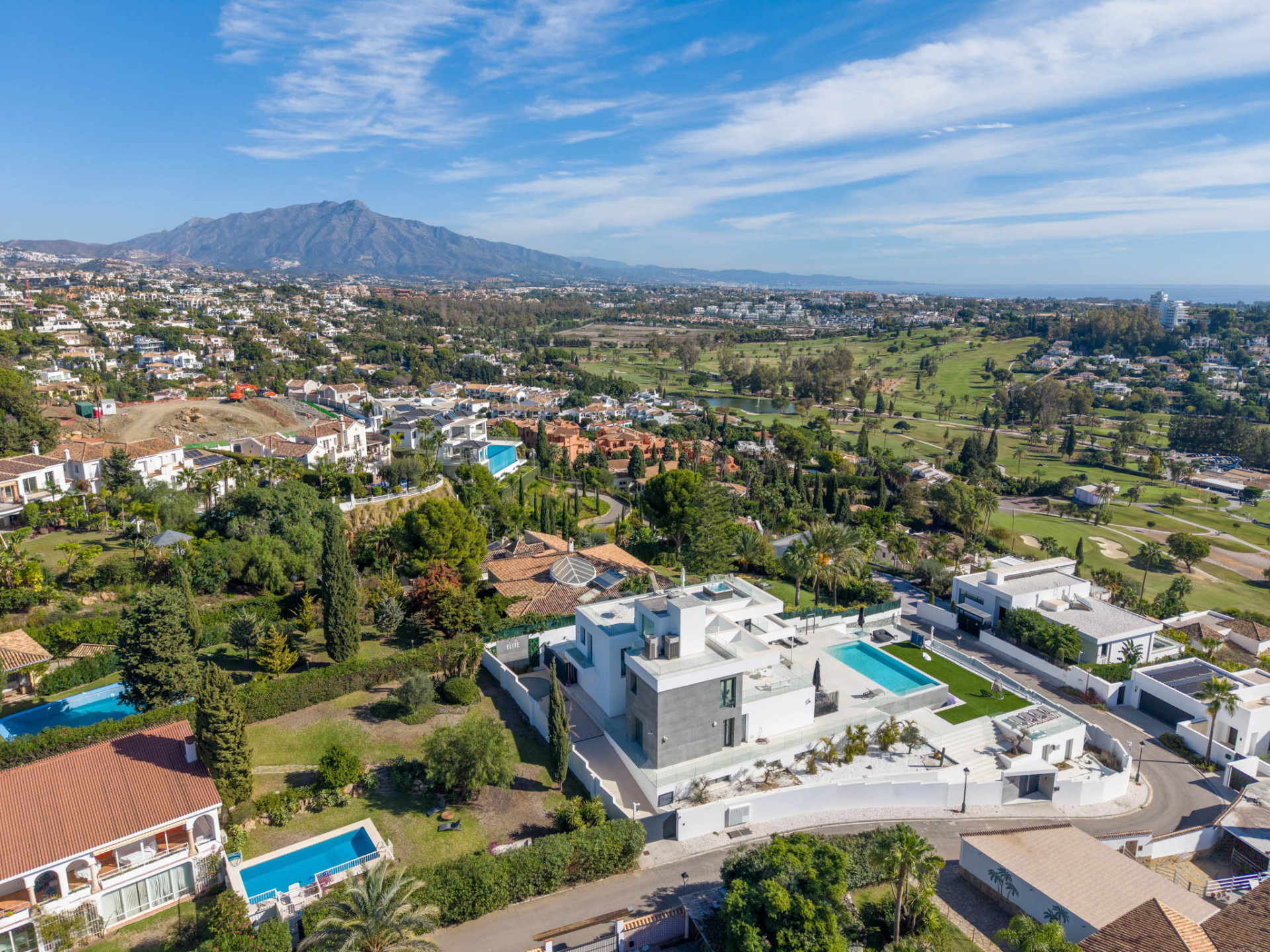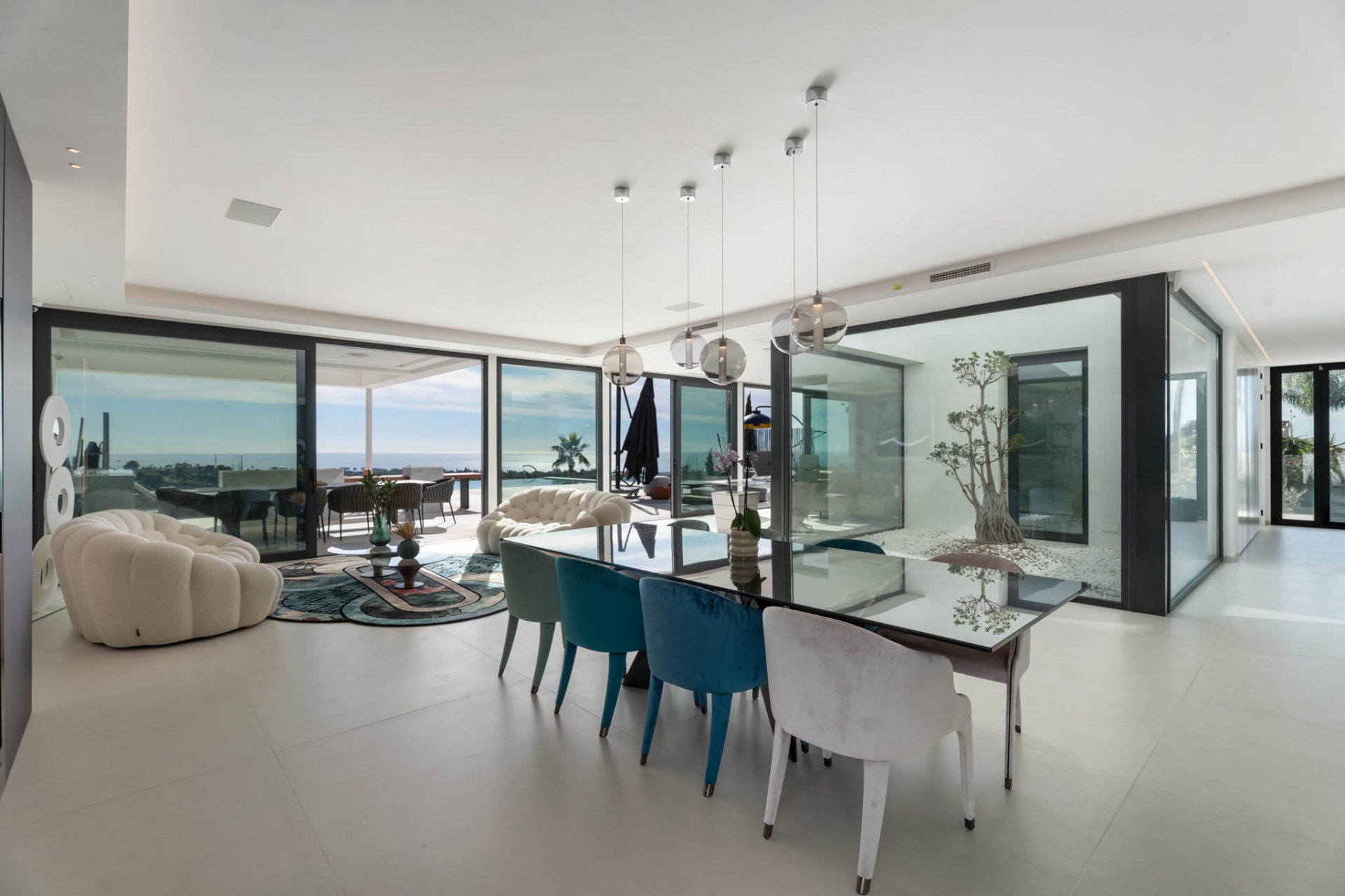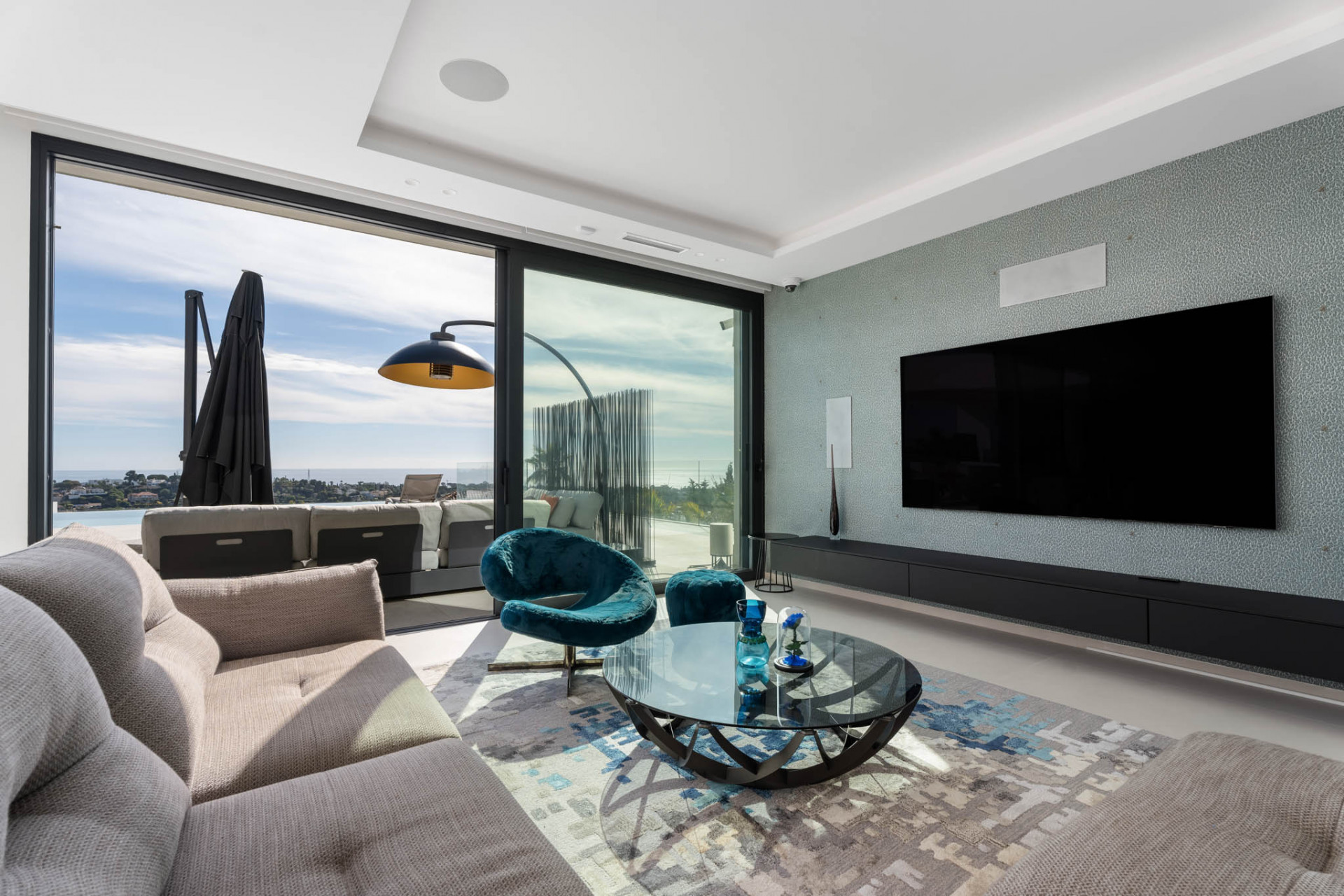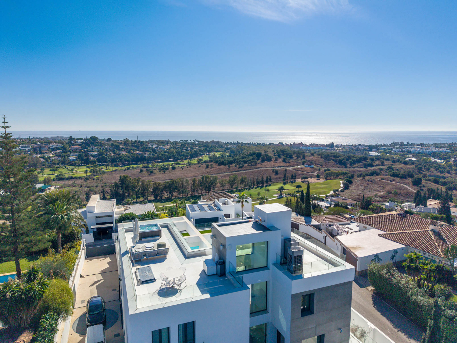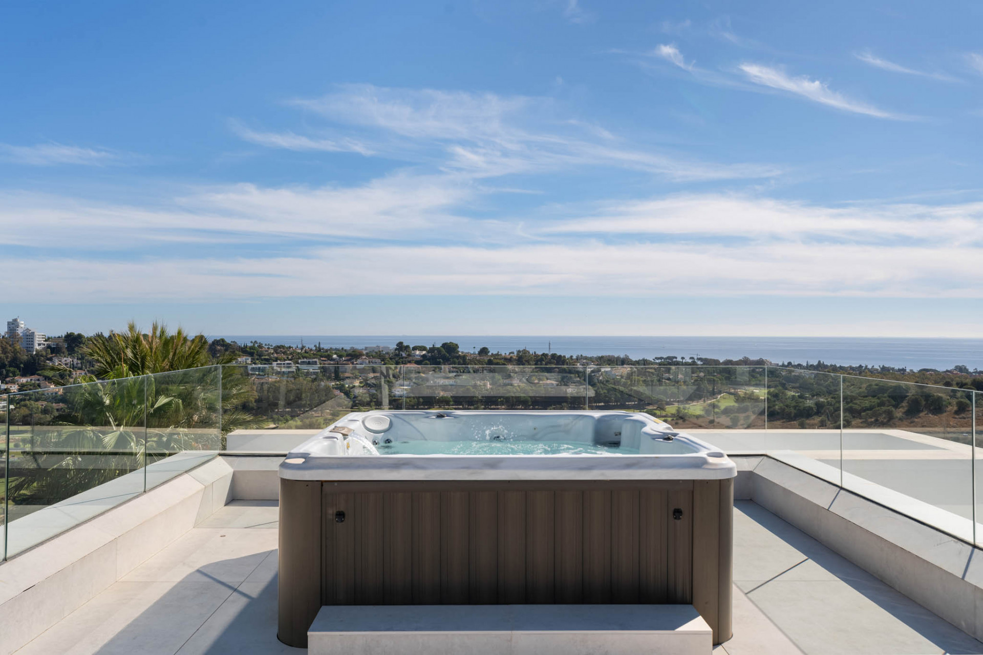 Esta villa de diseño en Paraiso Alto se presenta como una residencia de estilo contemporáneo creada para quienes buscan privacidad, amplitud y una conexión directa con el entorno. Su posición elevada permite disfrutar de vistas a El Paraíso Golf, el Mediterráneo, Gibraltar, la costa africana y la montaña de La Concha desde varias estancias y zonas exteriores, creando un entorno visual distintivo. La propiedad se distribuye en varios niveles conectados por un ascensor, con amplias estancias y luz natural que fluye por toda la vivienda. En la planta principal, salón y comedor tienen acceso directo a la terraza y al jardín a través de grandes ventanales que integran el exterior con el interior. La piscina infinita se extiende hacia el horizonte, reforzando la sensación de continuidad con el paisaje. La villa ofrece seis dormitorios, todos con baños en suite diseñados para el confort y la privacidad. La suite principal disfruta de vistas al mar y acceso a una terraza privada. La planta superior incluye un solárium con jacuzzi y vistas panorámicas que abarcan desde el campo de golf hasta África, proporcionando un espacio exclusivo para contemplar el entorno desde el punto más alto de la propiedad. La planta inferior alberga las áreas de bienestar y entretenimiento, incluyendo una sala de cine, gimnasio, sauna y un espacio independiente diseñado para reuniones. La propiedad también cuenta con un amplio garaje con plataformas giratorias que facilitan la maniobrabilidad. Un sistema centralizado de domótica permite el control remoto de diversos aspectos de la villa, mientras que la instalación solar de alta capacidad contribuye a la eficiencia energética. El diseño general prioriza las líneas limpias, proporciones equilibradas y transiciones fluidas entre los espacios. Ubicada a menos de diez minutos de la playa y con rápido acceso a Puerto Banús y Marbella, esta villa ofrece una residencia contemporánea en una zona consolidada de Benahavís, combinando amplitud, vistas abiertas y una distribución arquitectónica pensada para la vida diaria.