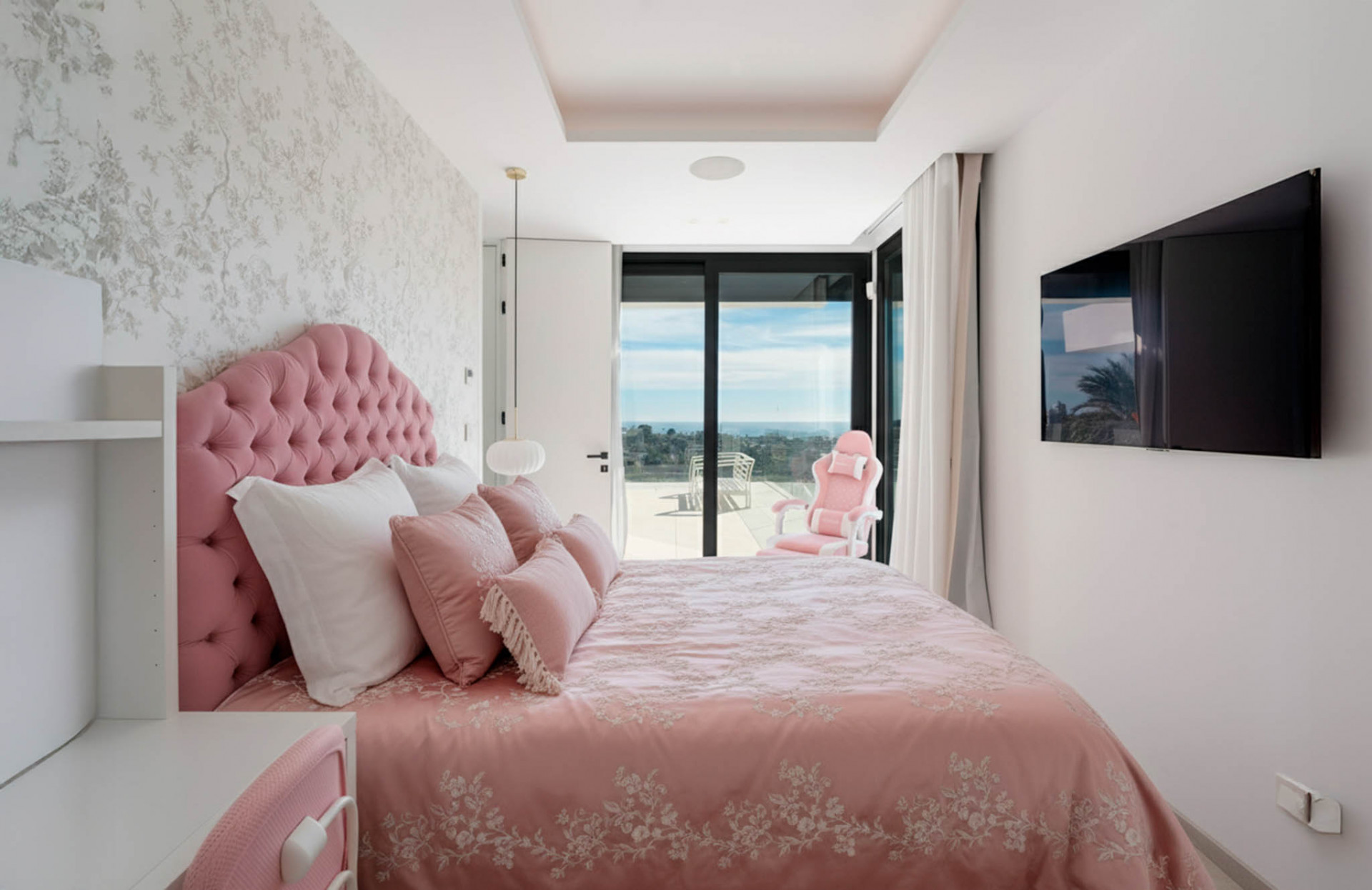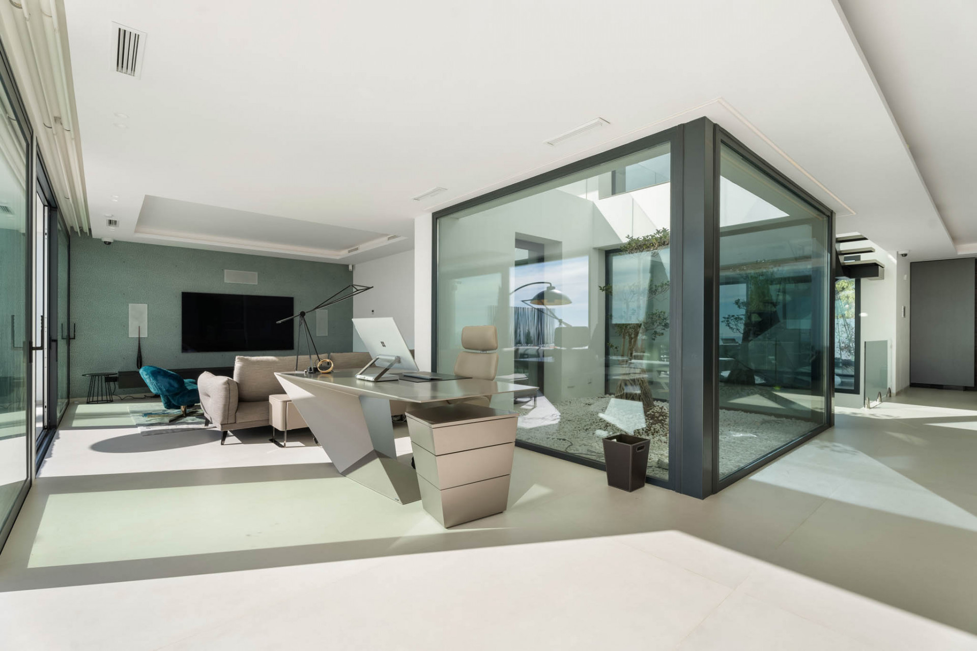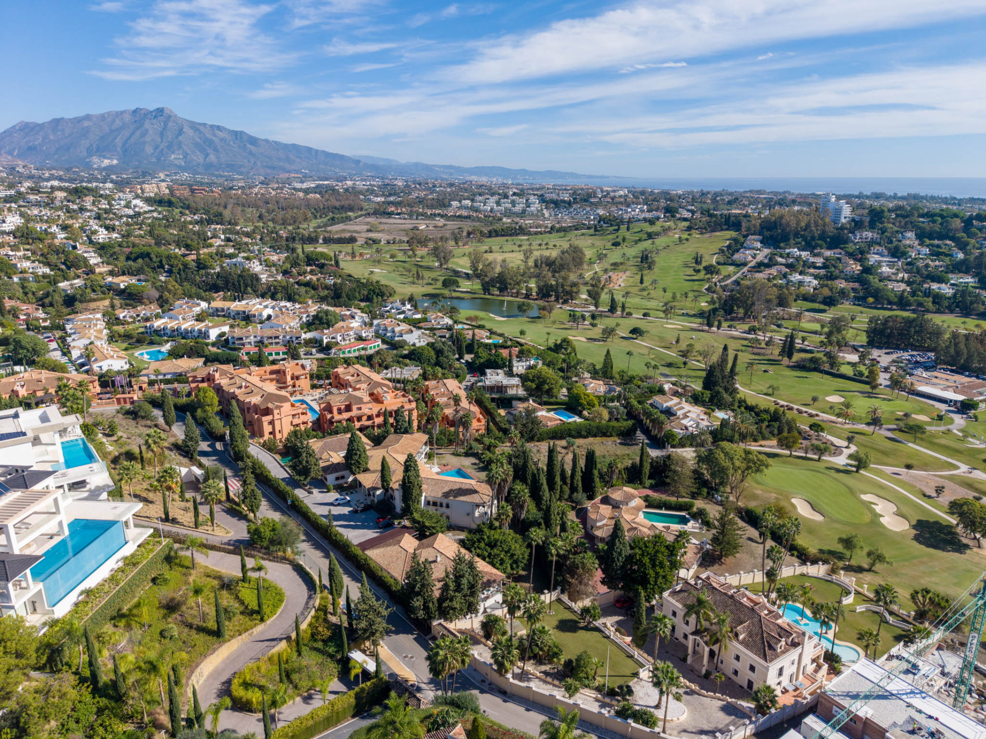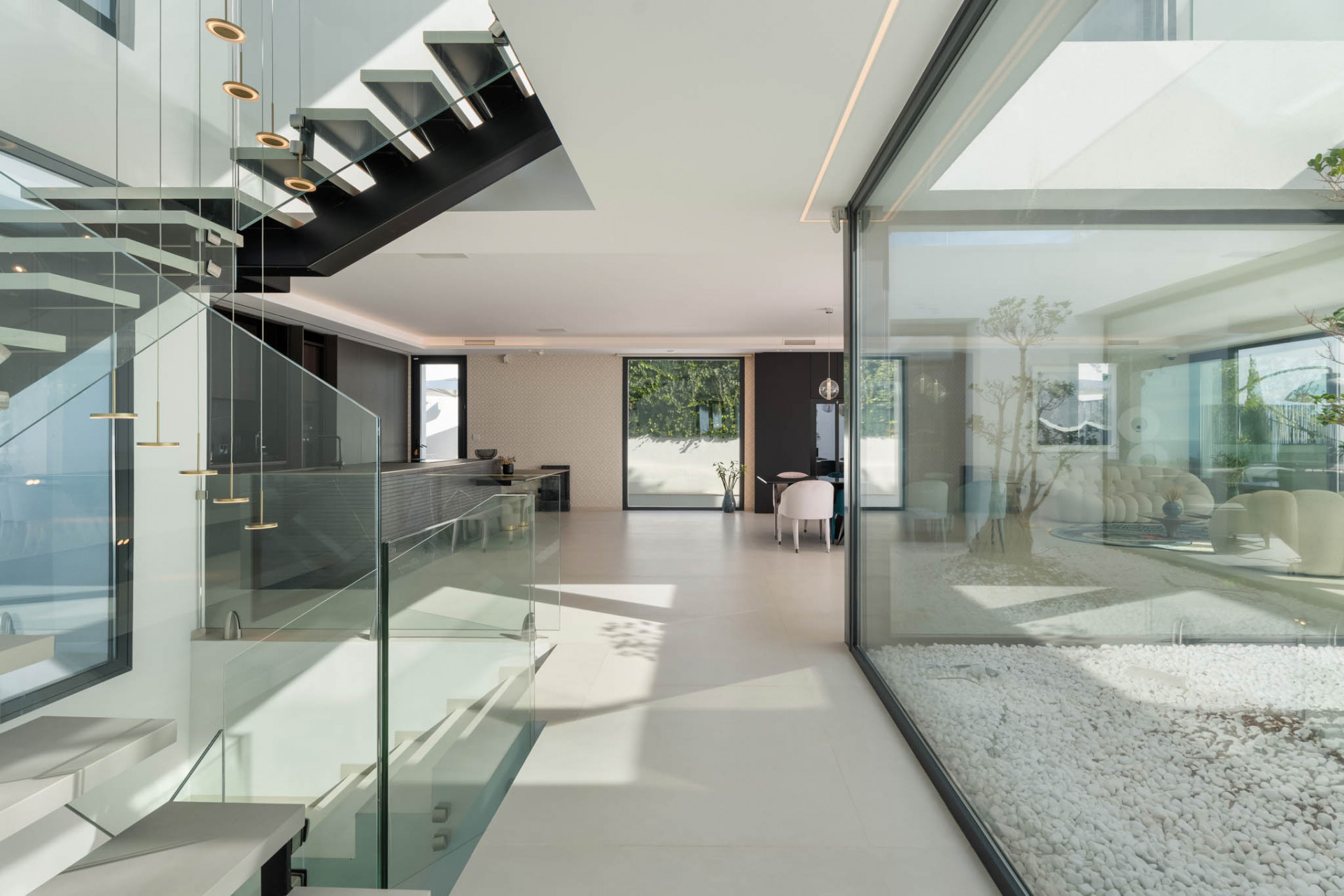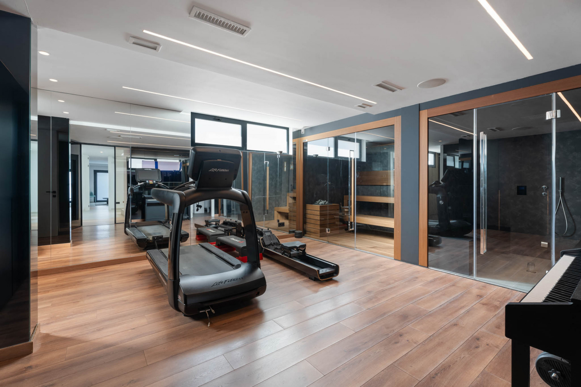 Esta villa de diseño en Paraiso Alto se presenta como una residencia de estilo contemporáneo creada para quienes buscan privacidad, amplitud y una conexión directa con el entorno. Su posición elevada permite disfrutar de vistas a El Paraíso Golf, el Mediterráneo, Gibraltar, la costa africana y la montaña de La Concha desde varias estancias y zonas exteriores, creando un entorno visual distintivo. La propiedad se distribuye en varios niveles conectados por un ascensor, con amplias estancias y luz natural que fluye por toda la vivienda. En la planta principal, salón y comedor tienen acceso directo a la terraza y al jardín a través de grandes ventanales que integran el exterior con el interior. La piscina infinita se extiende hacia el horizonte, reforzando la sensación de continuidad con el paisaje. La villa ofrece seis dormitorios, todos con baños en suite diseñados para el confort y la privacidad. La suite principal disfruta de vistas al mar y acceso a una terraza privada. La planta superior incluye un solárium con jacuzzi y vistas panorámicas que abarcan desde el campo de golf hasta África, proporcionando un espacio exclusivo para contemplar el entorno desde el punto más alto de la propiedad. La planta inferior alberga las áreas de bienestar y entretenimiento, incluyendo una sala de cine, gimnasio, sauna y un espacio independiente diseñado para reuniones. La propiedad también cuenta con un amplio garaje con plataformas giratorias que facilitan la maniobrabilidad. Un sistema centralizado de domótica permite el control remoto de diversos aspectos de la villa, mientras que la instalación solar de alta capacidad contribuye a la eficiencia energética. El diseño general prioriza las líneas limpias, proporciones equilibradas y transiciones fluidas entre los espacios. Ubicada a menos de diez minutos de la playa y con rápido acceso a Puerto Banús y Marbella, esta villa ofrece una residencia contemporánea en una zona consolidada de Benahavís, combinando amplitud, vistas abiertas y una distribución arquitectónica pensada para la vida diaria.