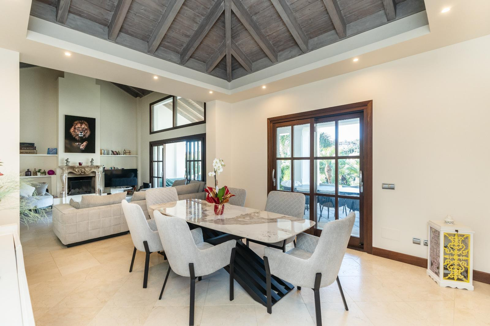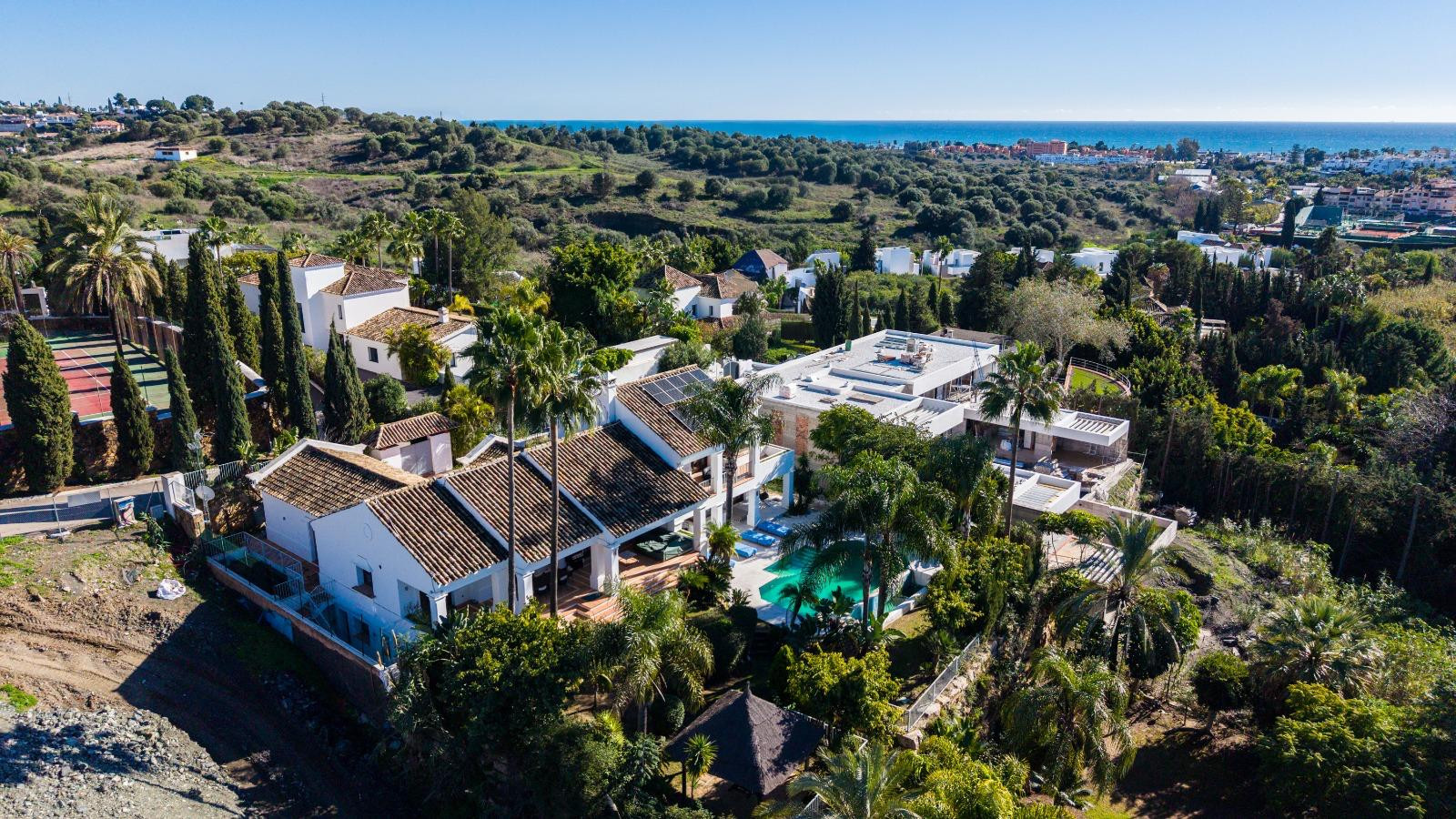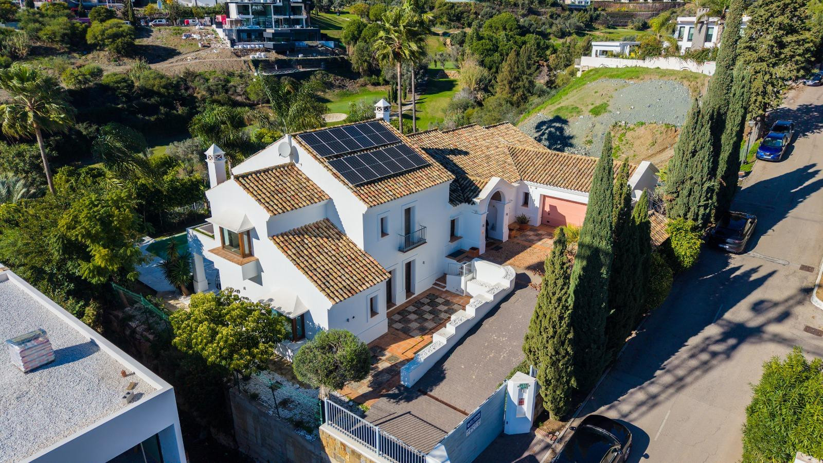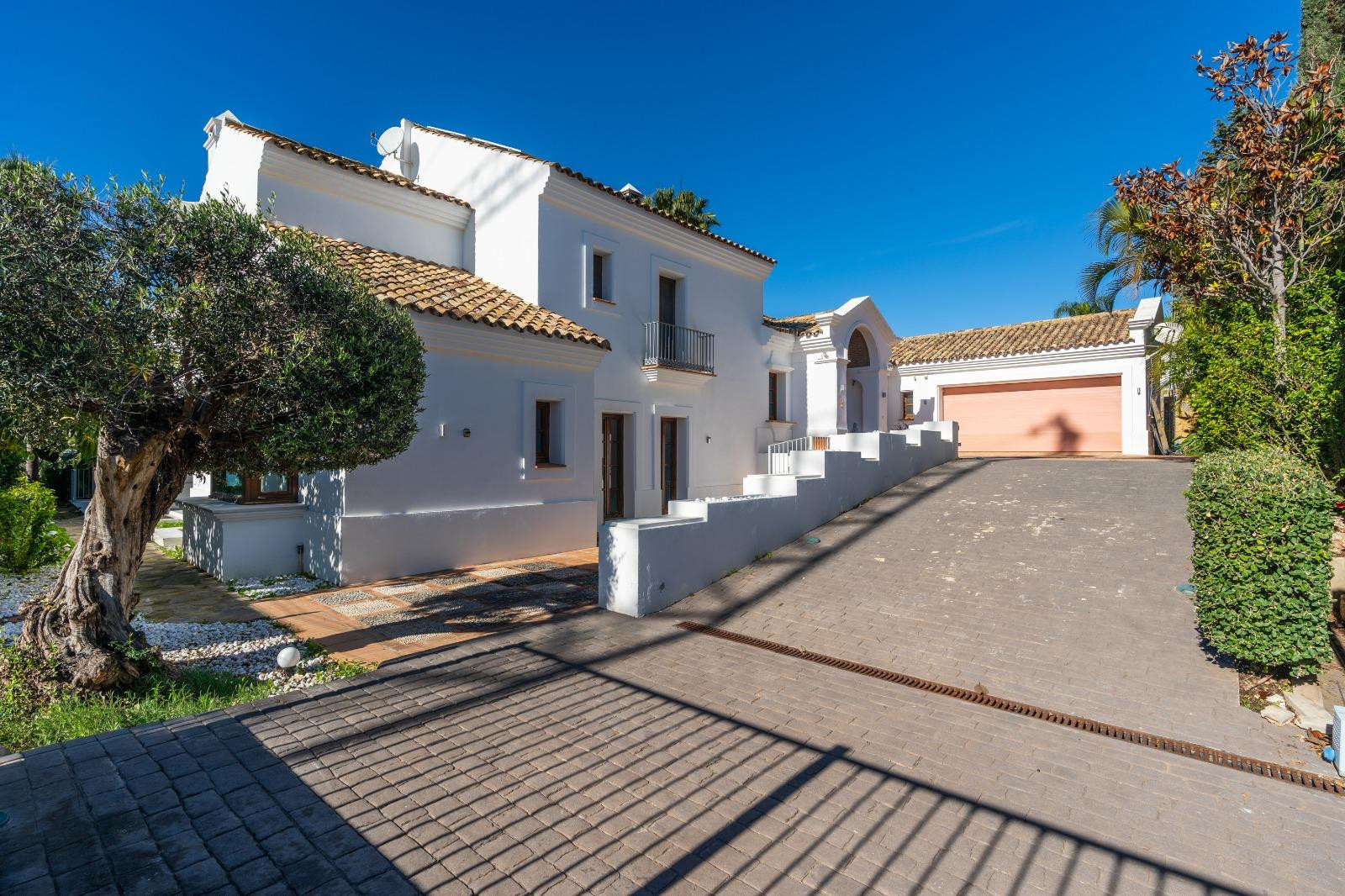 Cette villa exclusive est située dans le quartier prisé d’El Paraíso et se distingue par son emplacement privilégié en première ligne de golf. La propriété, en excellent état, offre une intimité absolue grâce à son vaste jardin privé, luxuriant et soigneusement entretenu. Une majestueuse porte d’entrée mène à un grand hall qui s’ouvre sur un vaste salon avec cheminée et une salle à manger attenante, dotée d’un plafond en poutres de bois massif, donnant à leur tour sur une grande terrasse couverte et une pergola extérieure permettant de profiter de belles vues sur le jardin et la piscine privée, créant ainsi un cadre idéal pour la détente et les loisirs. Cuisine entièrement équipée avec coin petit-déjeuner. La maison dispose de trois chambres, toutes avec salle de bains privative, ainsi qu’un cabinet de toilette pour invités. La chambre principale comprend un élégant dressing et un plafond à double hauteur avec poutres en bois, apportant chaleur et caractère aux espaces. Elle dispose également d’un appartement pour invités, avec cuisine équipée, chambre et salle de bains, offrant un hébergement confortable et privé pour la famille ou les amis. Parmi ses nombreux équipements figurent un système de climatisation réversible, des fenêtres à double vitrage, des armoires encastrées et un système d’alarme moderne avec service de sécurité 24h/24. Pour le bien-être et les loisirs, la villa propose une salle de sport, une salle de cinéma-jeux et un bain turc. La proximité des services, commerces, restaurants, écoles et du centre-ville complète cette offre immobilière exceptionnelle, idéale pour ceux qui recherchent luxe, confort et un emplacement incomparable au bord du golf.