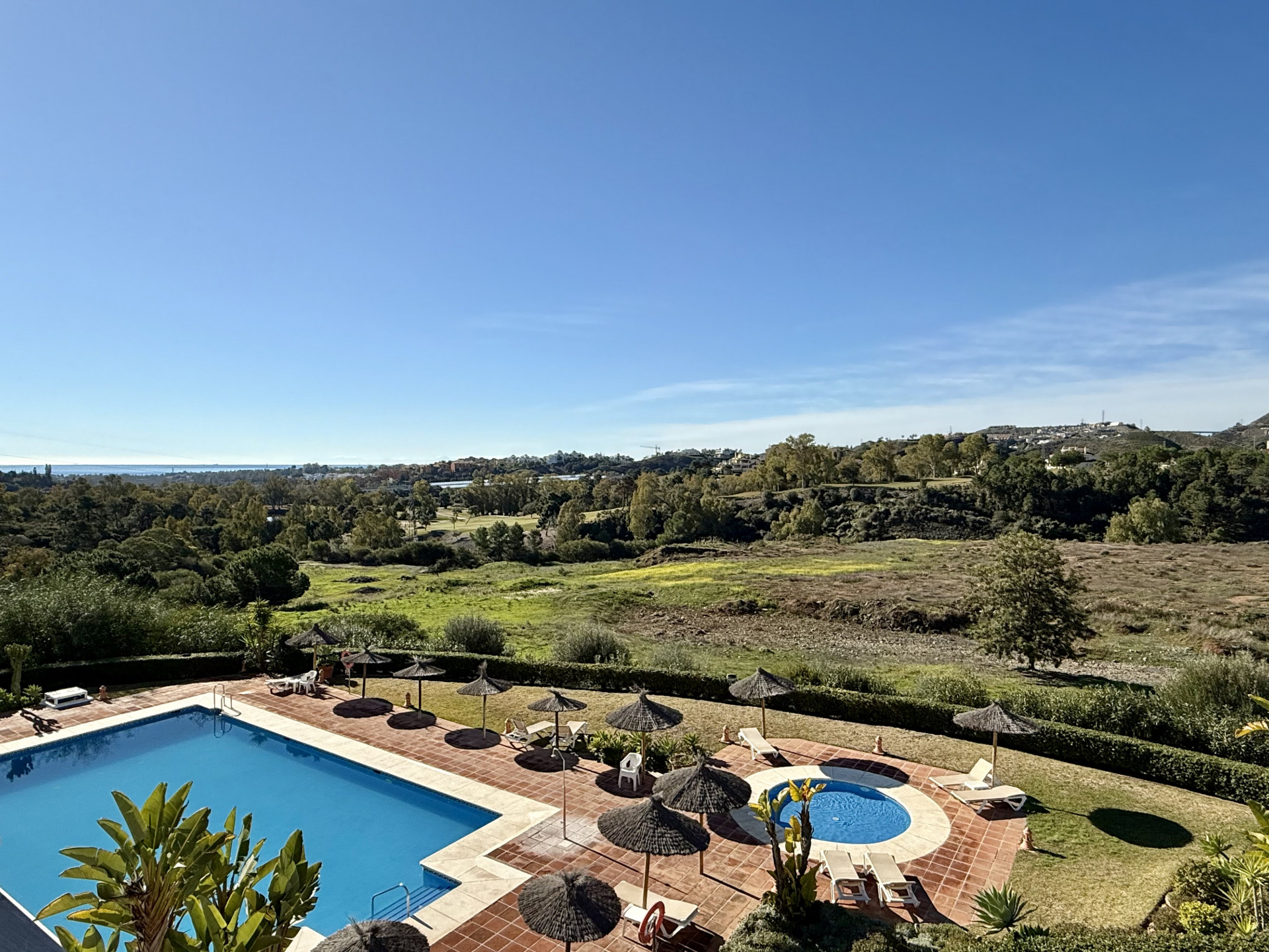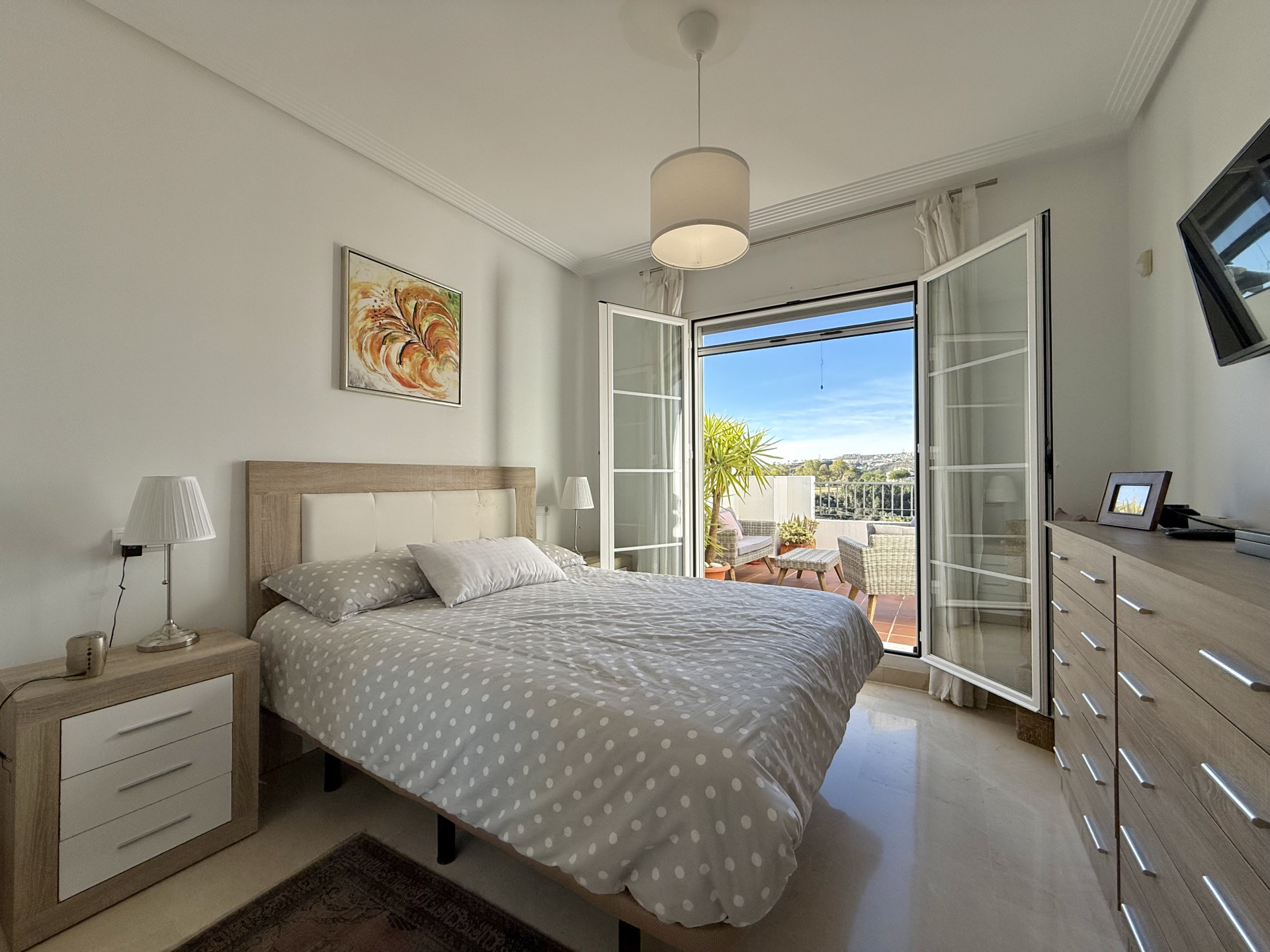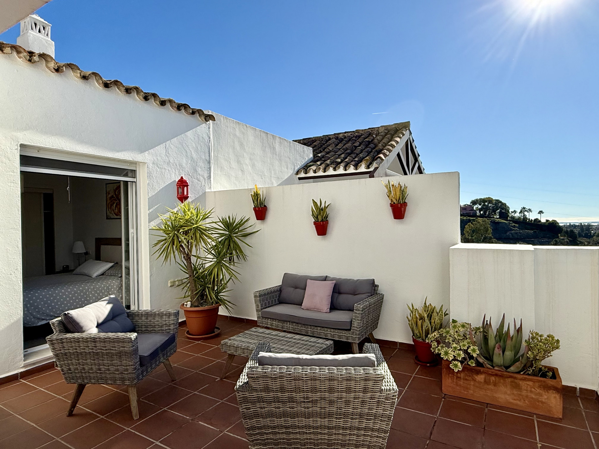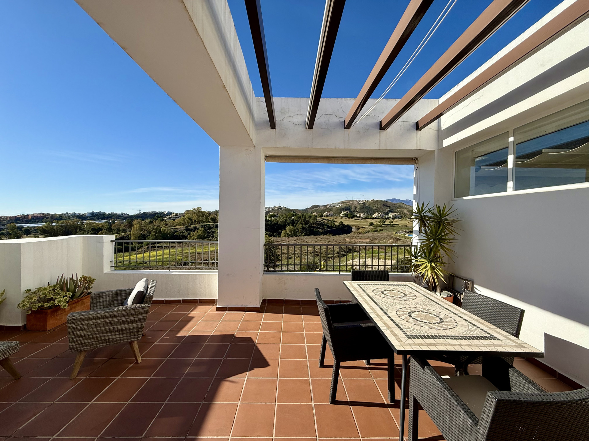 This exclusive penthouse is located in the prestigious area of Los Arqueros, Benahavís, Málaga, and stands out for its privileged position on the mountainside, surrounded by golf courses and just minutes from all amenities. The property offers panoramic views of the sea, mountains, countryside, and golf course. It features two spacious bedrooms and two bathrooms. The interior has been designed to provide maximum comfort, including air conditioning, a living-dining room, a fully equipped kitchen, and a laundry room. Built-in wardrobes, electric blinds, and double glazing provide functionality and security, complemented by an alarm system, secure entry, and 24-hour security service in the gated community. The penthouse offers an unparalleled living experience thanks to its private terrace, both covered and uncovered, ideal for enjoying views of the garden, pool, and natural surroundings. Additionally, the building has a lift, storage room, and private garage, ensuring maximum convenience. Residents can enjoy landscaped communal areas and the community pool, perfect for leisure and relaxation. The location is another of its great attractions, as it is close to golf courses, schools, restaurants, the port, and the city center. All this makes this penthouse a unique opportunity for those seeking an exclusive, secure, and well-connected property on the Costa del Sol.