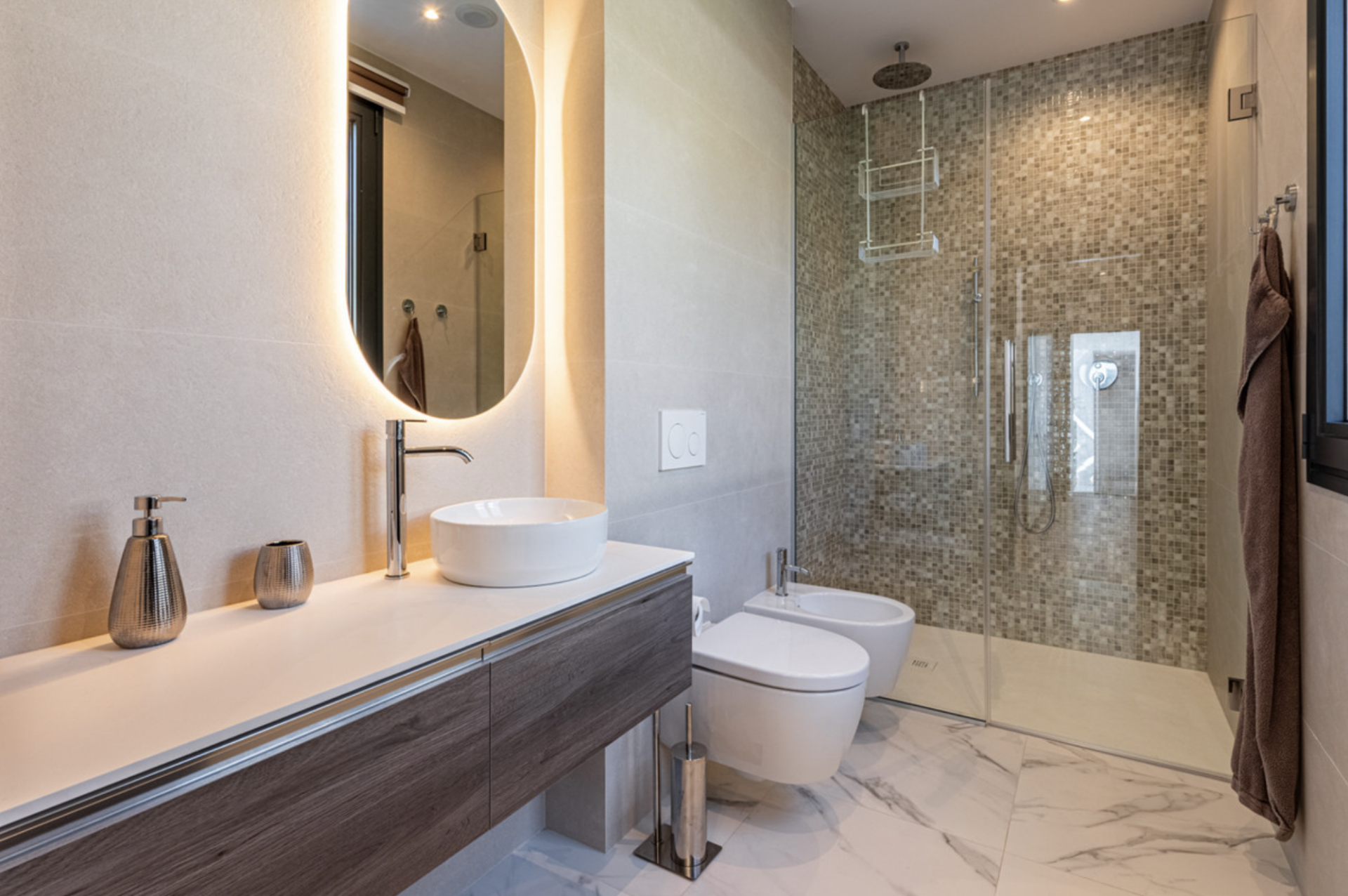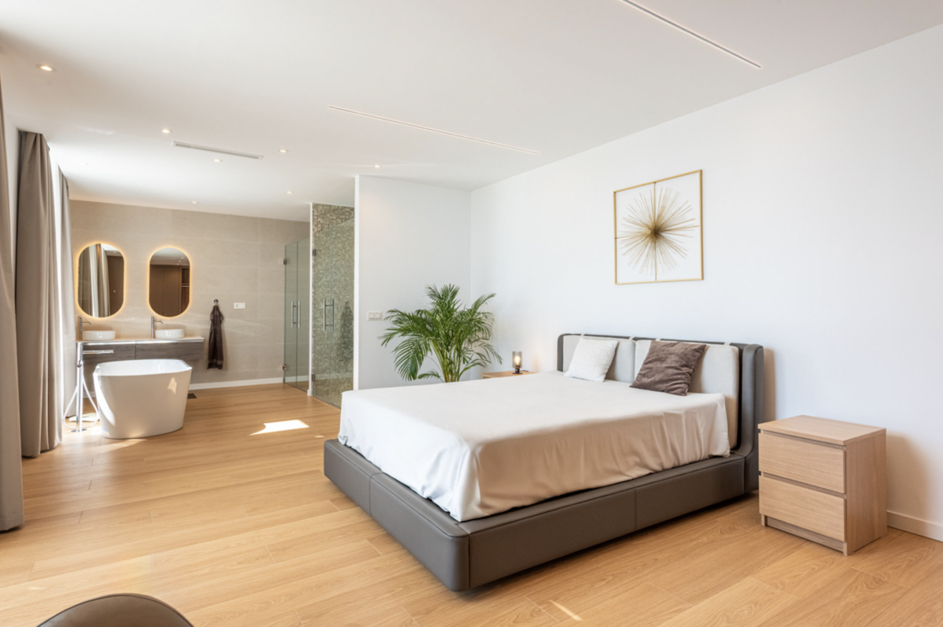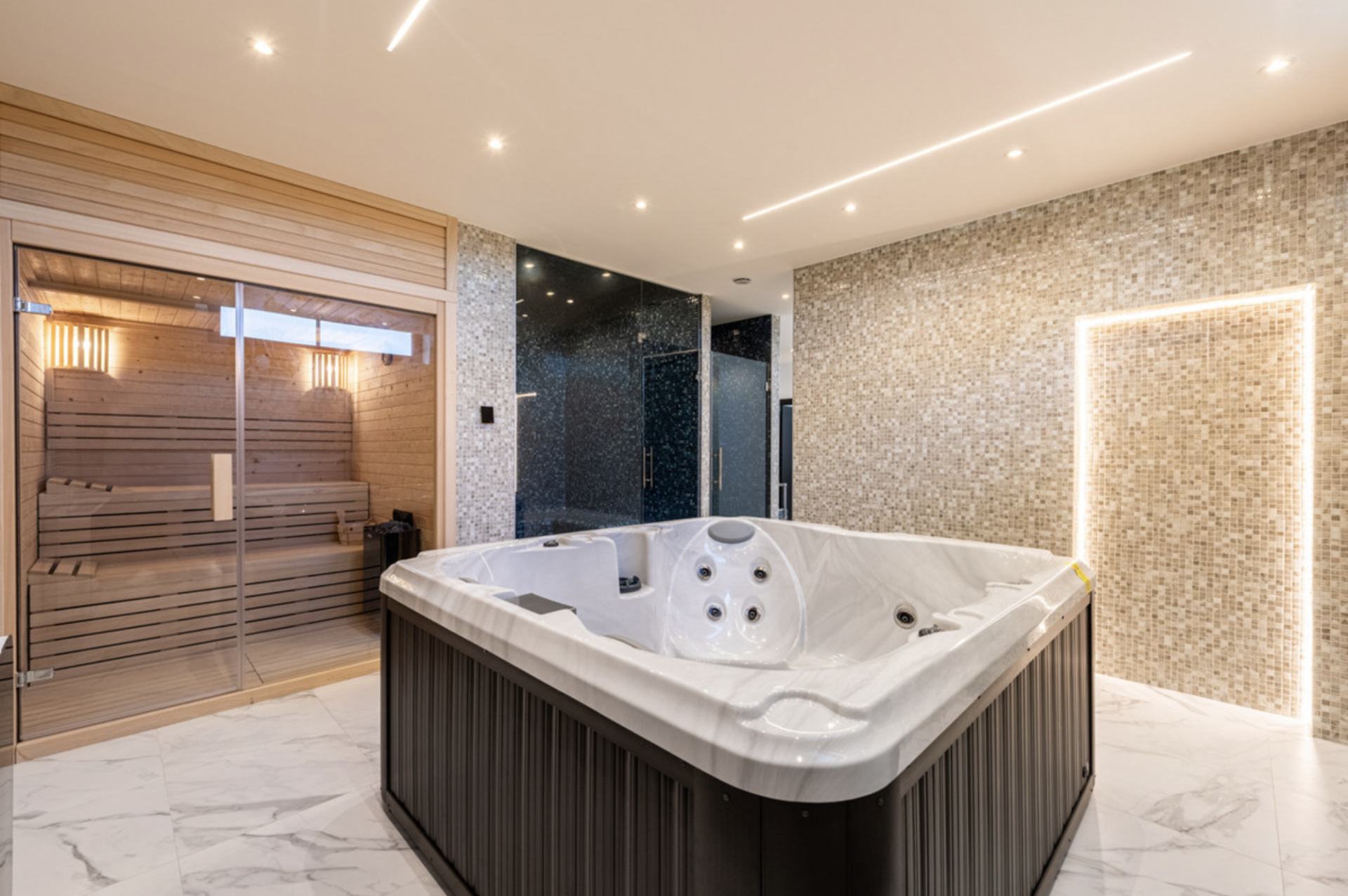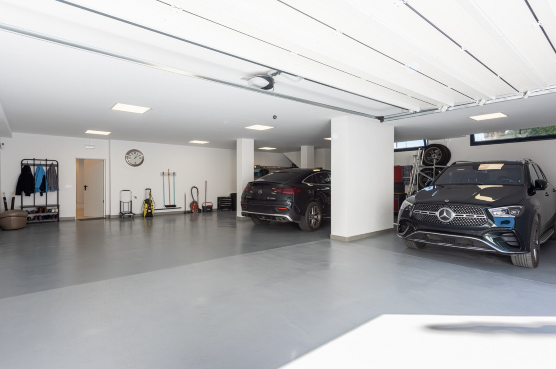 The basement is a big part of what makes this villa special. It’s not just storage. You have a full spa area, a gymnasium, a wine store, laundry, pantry space, multiple technical rooms, and a staff bedroom with its own bathroom. There’s also a garage and plenty of storage, so everything has its place and the main house stays clean and uncluttered. The villa includes a lift connecting the different levels and a complete climate system providing both heating and cooling.