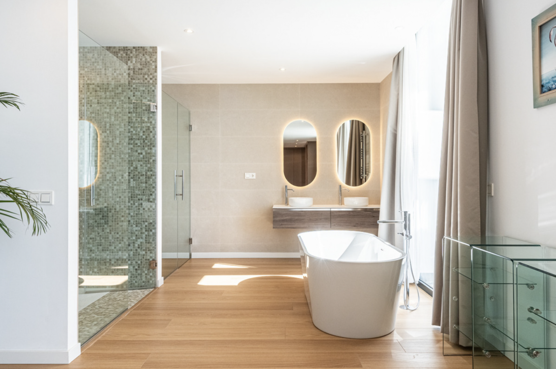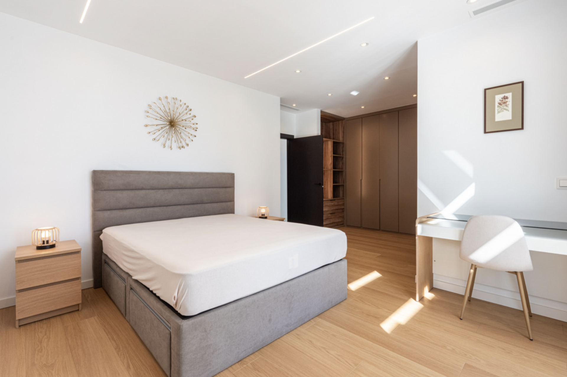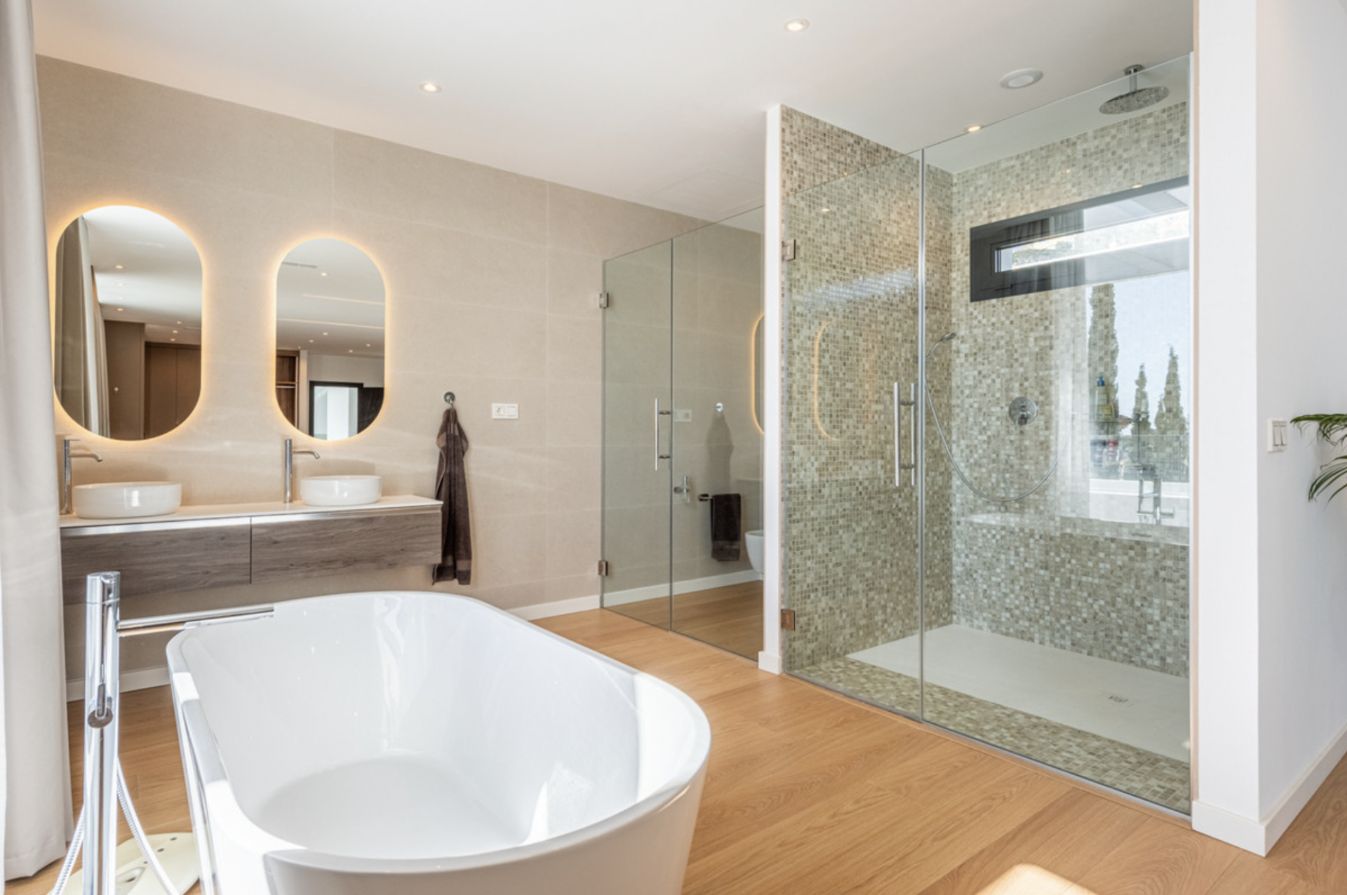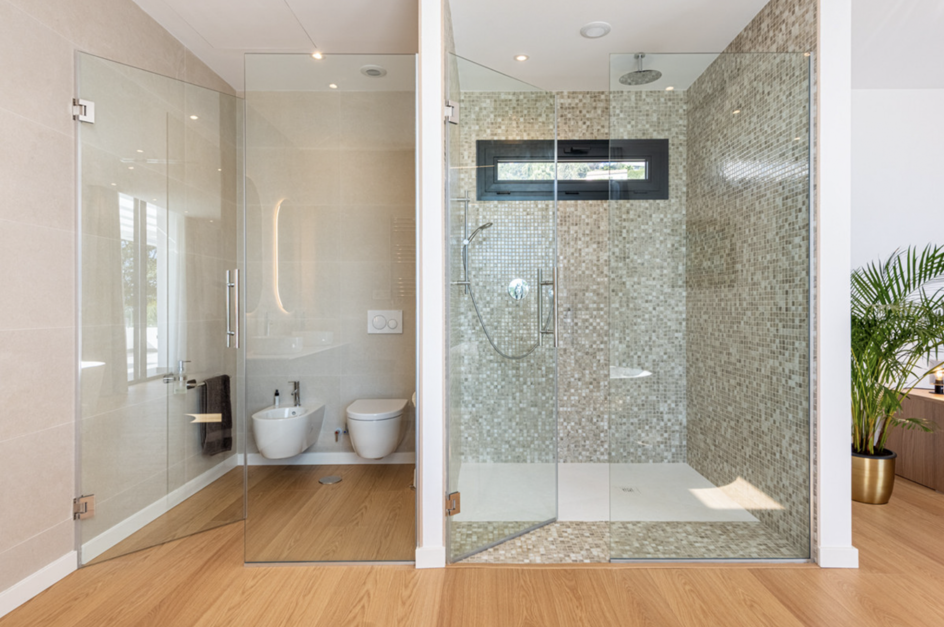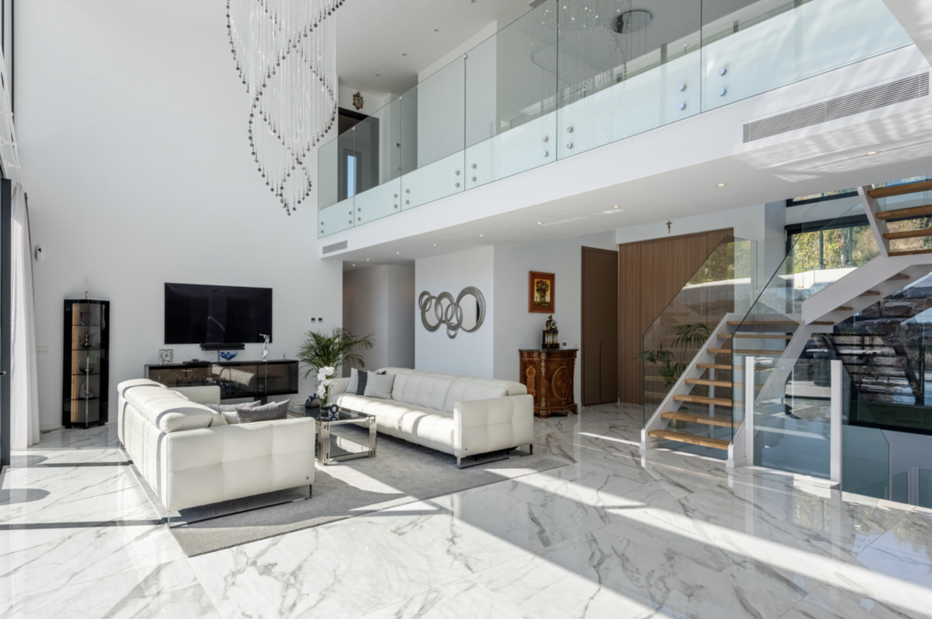 The basement is a big part of what makes this villa special. It’s not just storage. You have a full spa area, a gymnasium, a wine store, laundry, pantry space, multiple technical rooms, and a staff bedroom with its own bathroom. There’s also a garage and plenty of storage, so everything has its place and the main house stays clean and uncluttered. The villa includes a lift connecting the different levels and a complete climate system providing both heating and cooling.