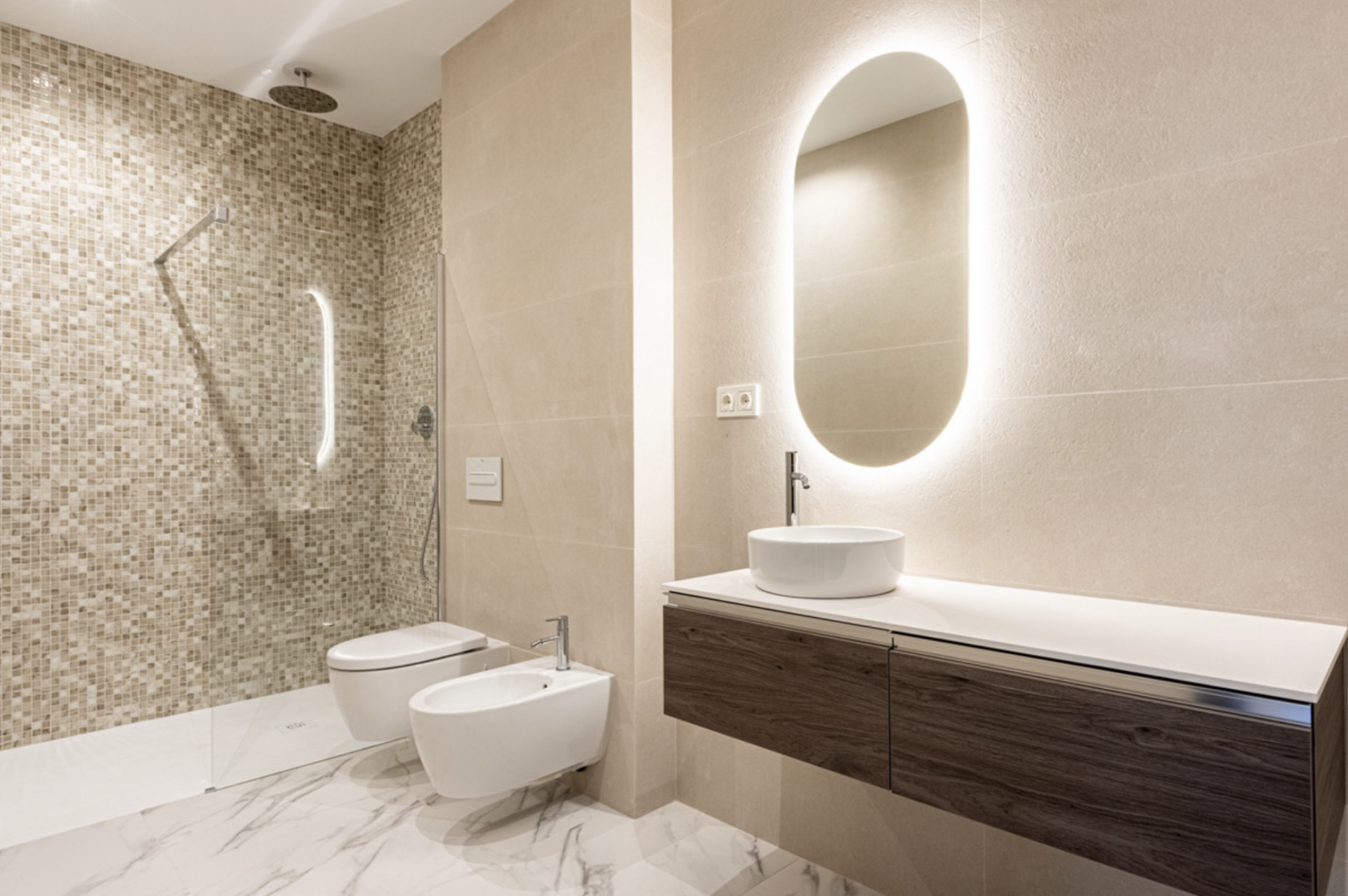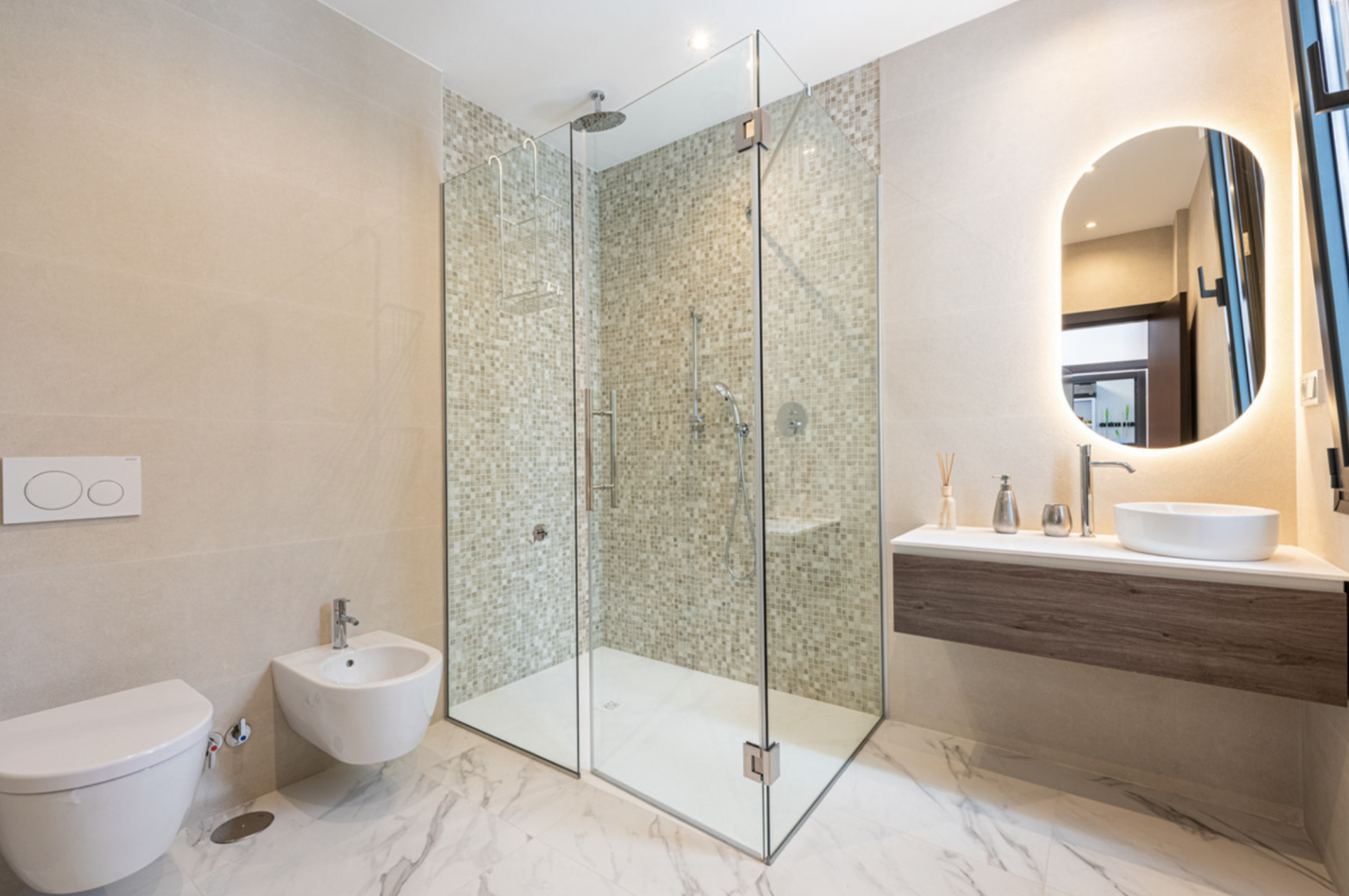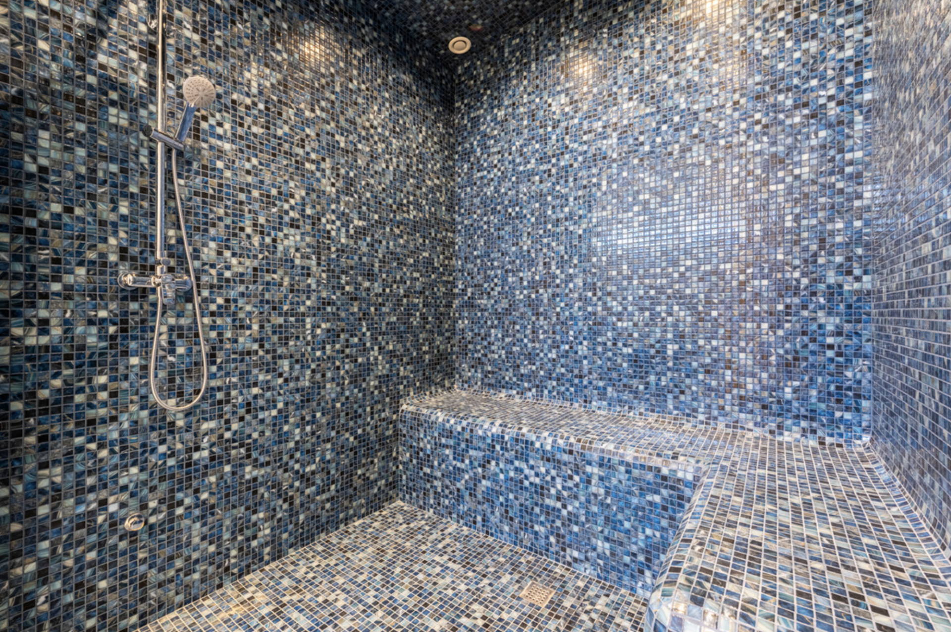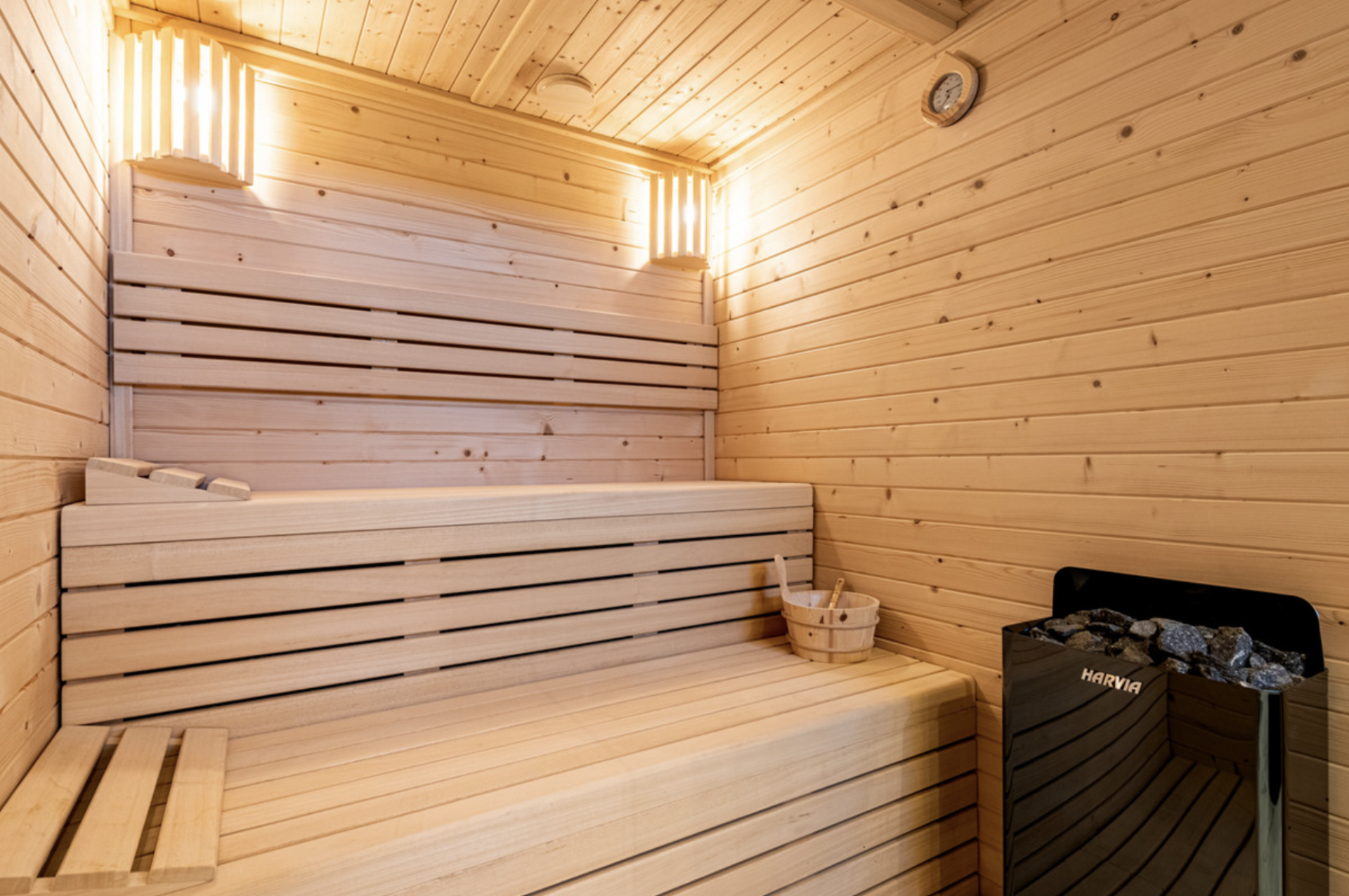 The basement is a big part of what makes this villa special. It’s not just storage. You have a full spa area, a gymnasium, a wine store, laundry, pantry space, multiple technical rooms, and a staff bedroom with its own bathroom. There’s also a garage and plenty of storage, so everything has its place and the main house stays clean and uncluttered. The villa includes a lift connecting the different levels and a complete climate system providing both heating and cooling.