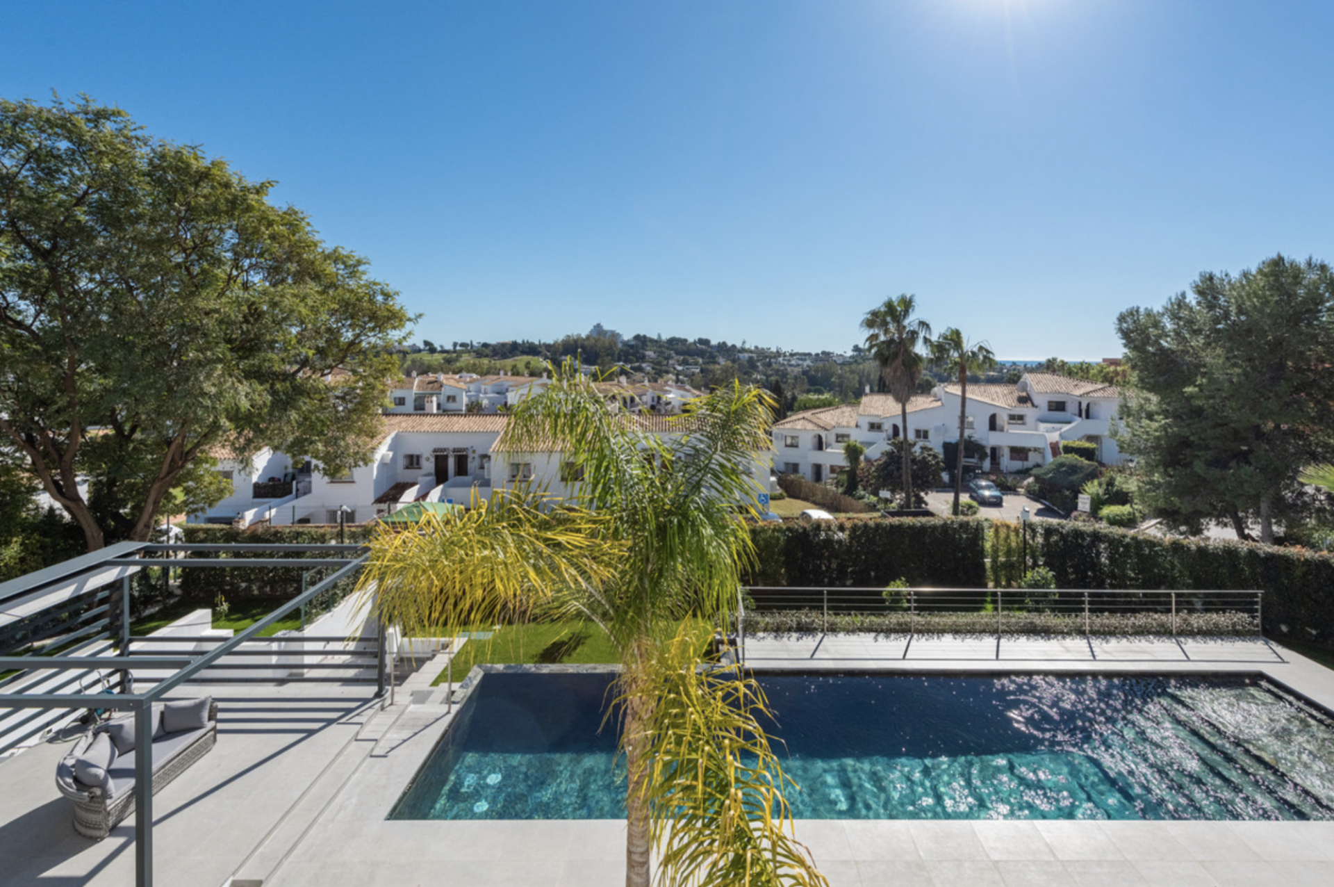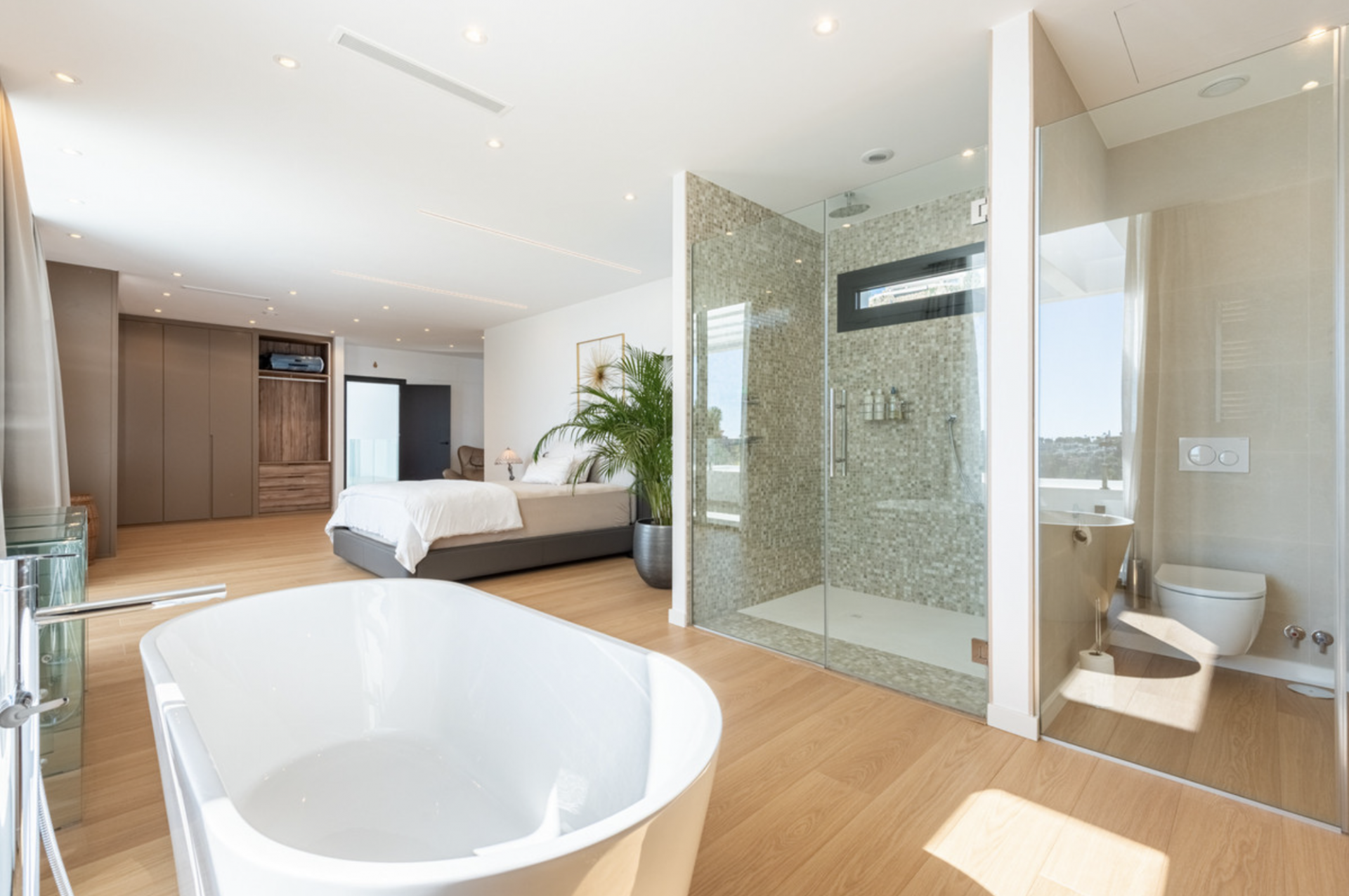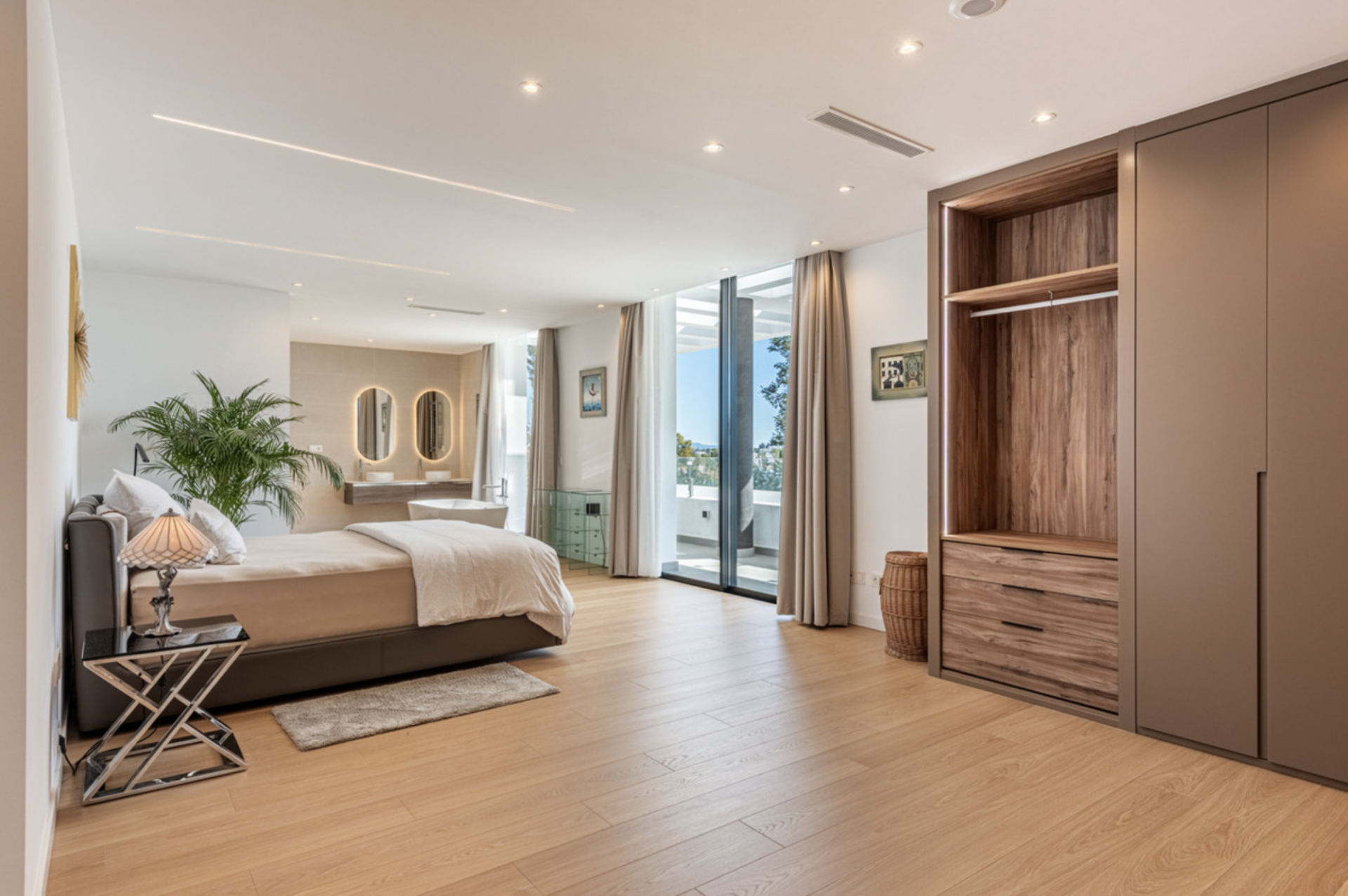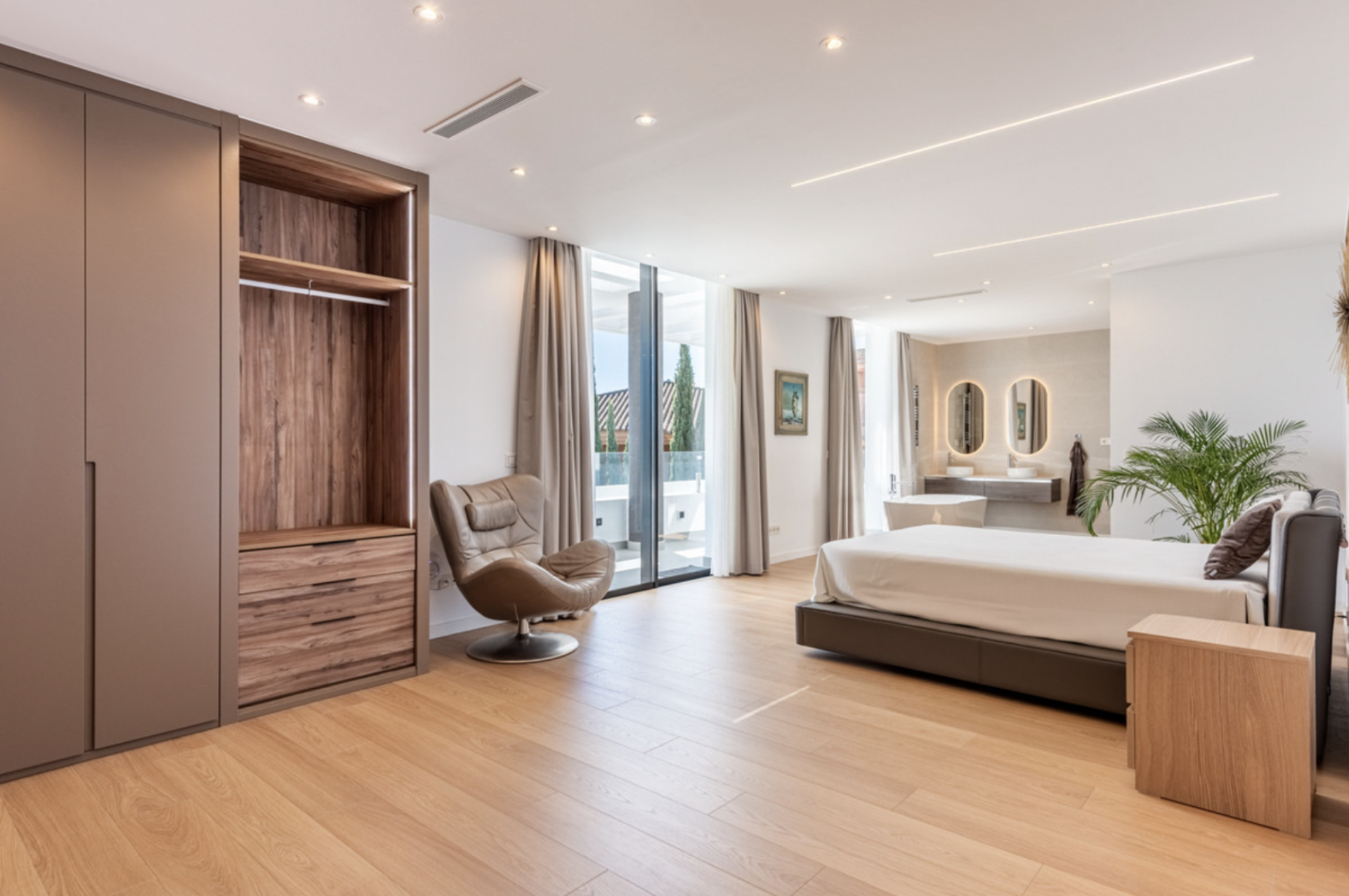 his family villa with great volume and a very practical layout is situated in Paraiso Alto, Benahavis at approximately 13 kms from Estepona and Marbella and at approximately 3,7 kms from the beach. El Paraíso Alto is a well established quiet area surrounded by golf courses. It is just a short drive from the vibrant nightlife and social life of Puerto Banús, private schools and supermarkets. The house is arranged over three levels, and you can move between them by stairs or lift, which makes day-to-day life very easy. The main level comprises an entrance hall and the heart of the home: generous living and dining spaces that connect naturally to the kitchen. The kitchen is supported by a pantry and additional storage, so it works well both for family life and for entertaining. Also on this level there are two en-suite bedrooms, each with its own dressing room and bathroom. It’s ideal for guests, teenagers, or anyone who prefers to avoid stairs. There’s also a guest toilet. Upstairs, the home turns into a private sleeping level. You have two large principal bedroom suites, both with dressing rooms and en-suite bathrooms, plus two studies and an additional room that can work as a sitting room, playroom, or extra office space. This floor also opens onto covered pergola terraces, giving you outdoor space with shade and privacy.