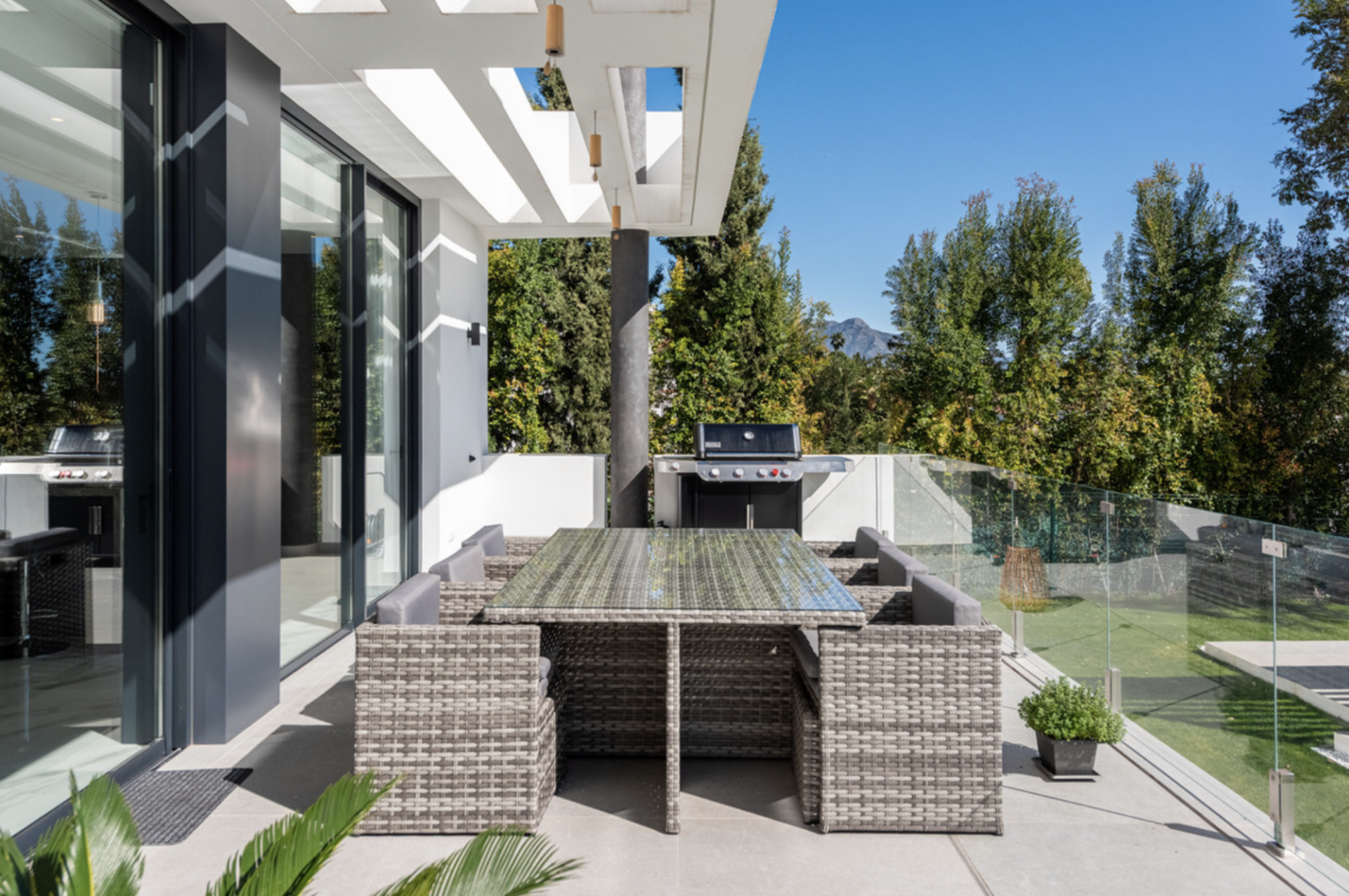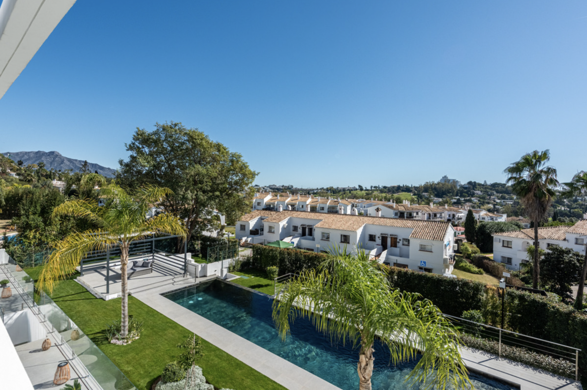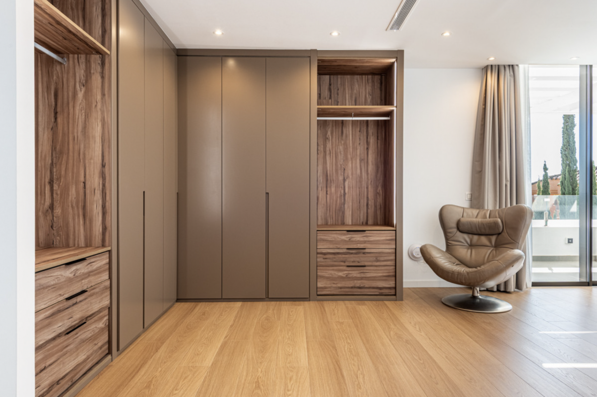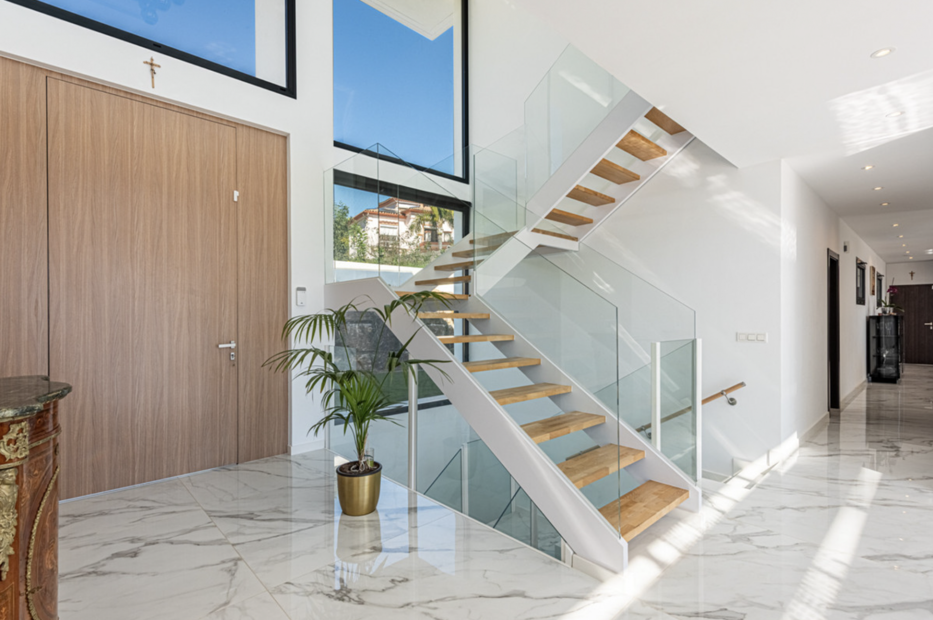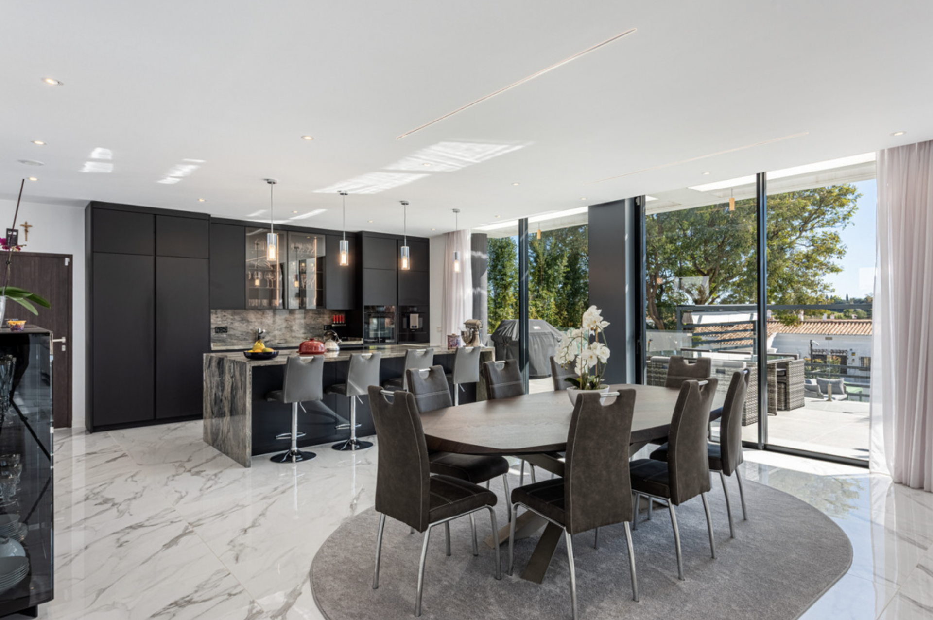 his family villa with great volume and a very practical layout is situated in Paraiso Alto, Benahavis at approximately 13 kms from Estepona and Marbella and at approximately 3,7 kms from the beach. El Paraíso Alto is a well established quiet area surrounded by golf courses. It is just a short drive from the vibrant nightlife and social life of Puerto Banús, private schools and supermarkets. The house is arranged over three levels, and you can move between them by stairs or lift, which makes day-to-day life very easy. The main level comprises an entrance hall and the heart of the home: generous living and dining spaces that connect naturally to the kitchen. The kitchen is supported by a pantry and additional storage, so it works well both for family life and for entertaining. Also on this level there are two en-suite bedrooms, each with its own dressing room and bathroom. It’s ideal for guests, teenagers, or anyone who prefers to avoid stairs. There’s also a guest toilet. Upstairs, the home turns into a private sleeping level. You have two large principal bedroom suites, both with dressing rooms and en-suite bathrooms, plus two studies and an additional room that can work as a sitting room, playroom, or extra office space. This floor also opens onto covered pergola terraces, giving you outdoor space with shade and privacy.