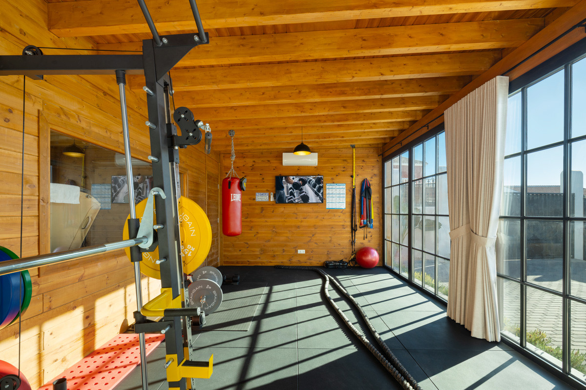 Inside, the villa offers a bright and spacious living room with fireplace, a formal dining area, and a modern, fully fitted kitchen. The connected guest apartment—with its own entrance and private kitchen—is ideal for teenagers, extended family, or guests seeking independence while remaining part of the main residence. Additional highlights include an air-conditioned gym, fitted wardrobes, laundry room, storage room, solarium, double glazing, alarm system, Wi-Fi, and a private garage.